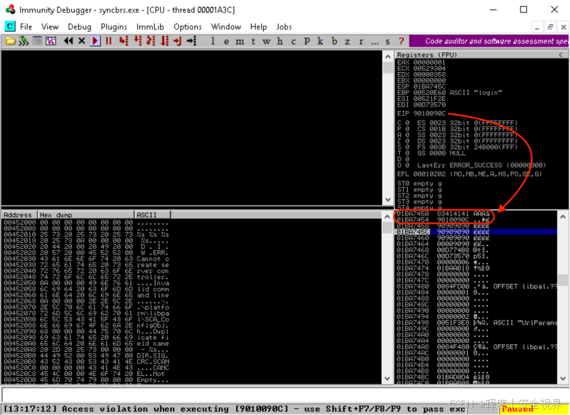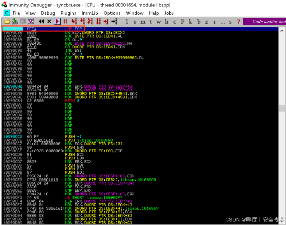 0x10090c83处暂停,EIP 寄存器(当前执行地址)正好显示这个值。这证明缓冲区溢出成功,地址覆盖准确 。你可以按F7/F8单步执行,亲眼看到它执行JMP ESP,然后滑入你的shellcode区域。 -