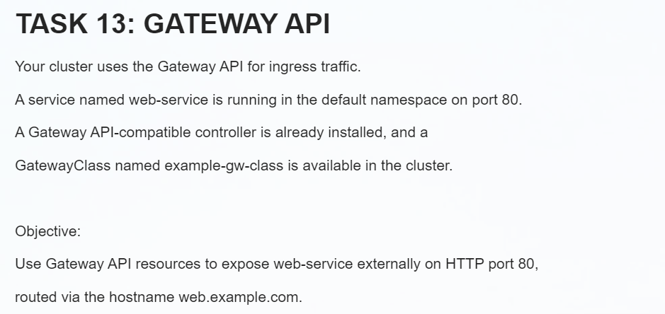 题目说Controller已经安装,不用配置"GatewayClass"对象。先配置"Gateway"