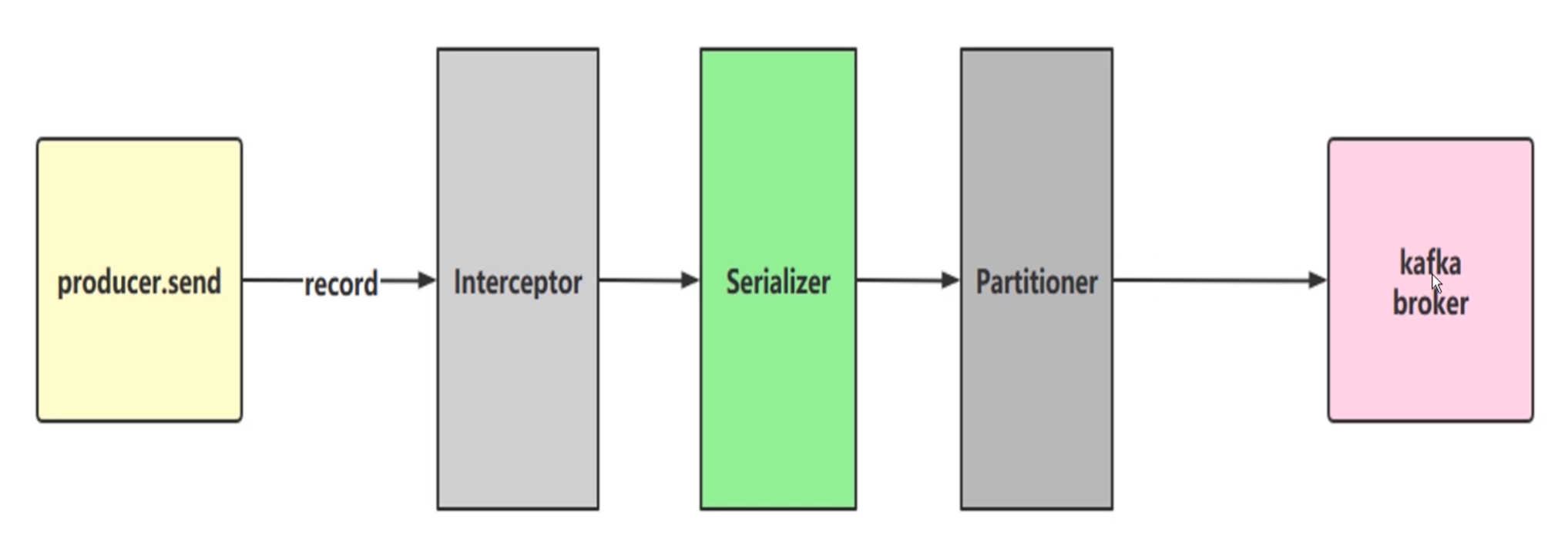 如图,kafka producer发送消息,依次经过生产者拦截器、序列化器、分区器,拿到partition分区的序号后最后再存到kafka broker上。这里的record就是指ProducerRecord,如果没有指定partition分区,就会通过分区器内部算法根据key计算一个分区序号,如果指定了partition分区,就不会走分区器,直接根据指定的partition分区存到kafka broker上。