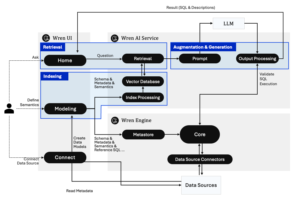 WrenAI的系统架构由三大核心服务组成,各司其职又协同工作: