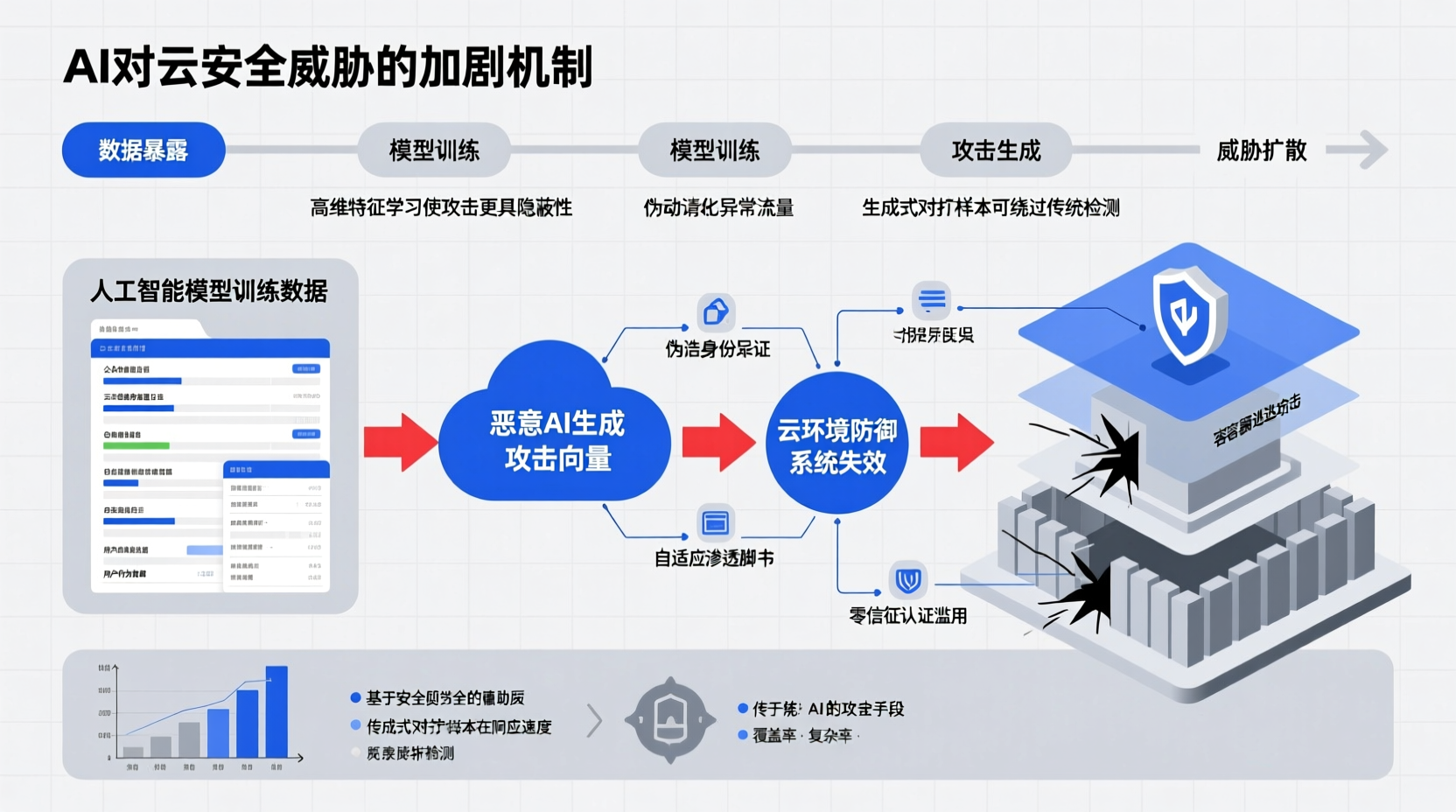 本文将深入探讨AI技术如何系统性加剧云安全威胁的内在机制,重点分析攻击自动化、智能化漏洞挖掘、对抗性攻击以及云环境特有的风险向量。理解这些机制不仅有助于安全团队把握威胁演进的脉络,也为构建更具韧性的云安全防护体系提供思考方向。