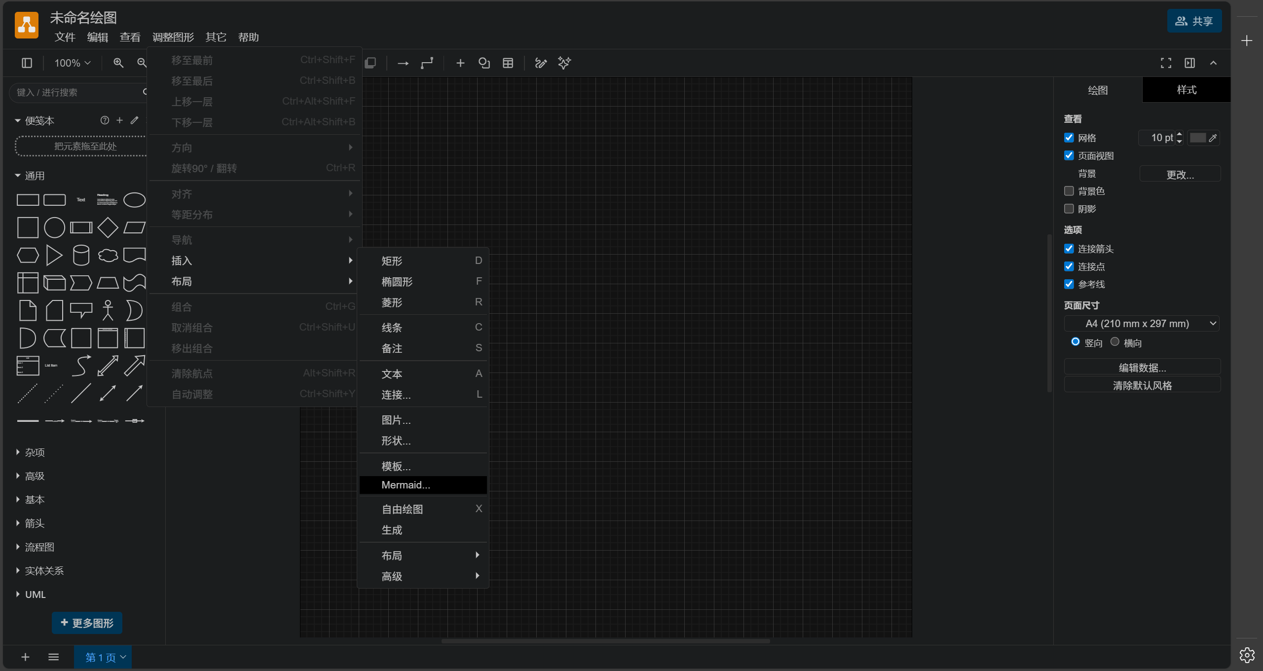 通过绘图软件(draw.io),将mermaid代码插入( 调整图形-> 插入 -> Mermaid),可以进行二次更改