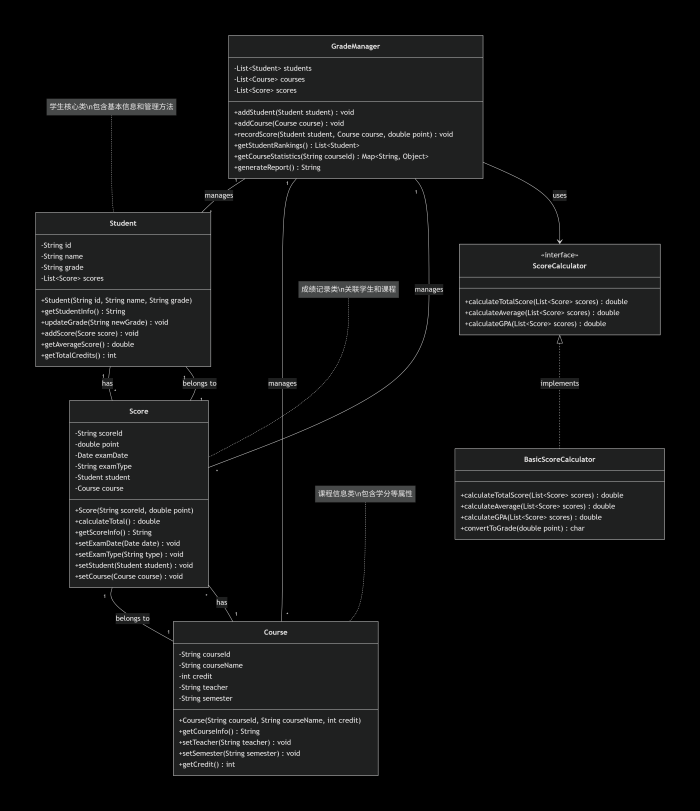 核心方法: Student 的 getStudentInfo()、updateGrade();Score 的 calculateTotal()