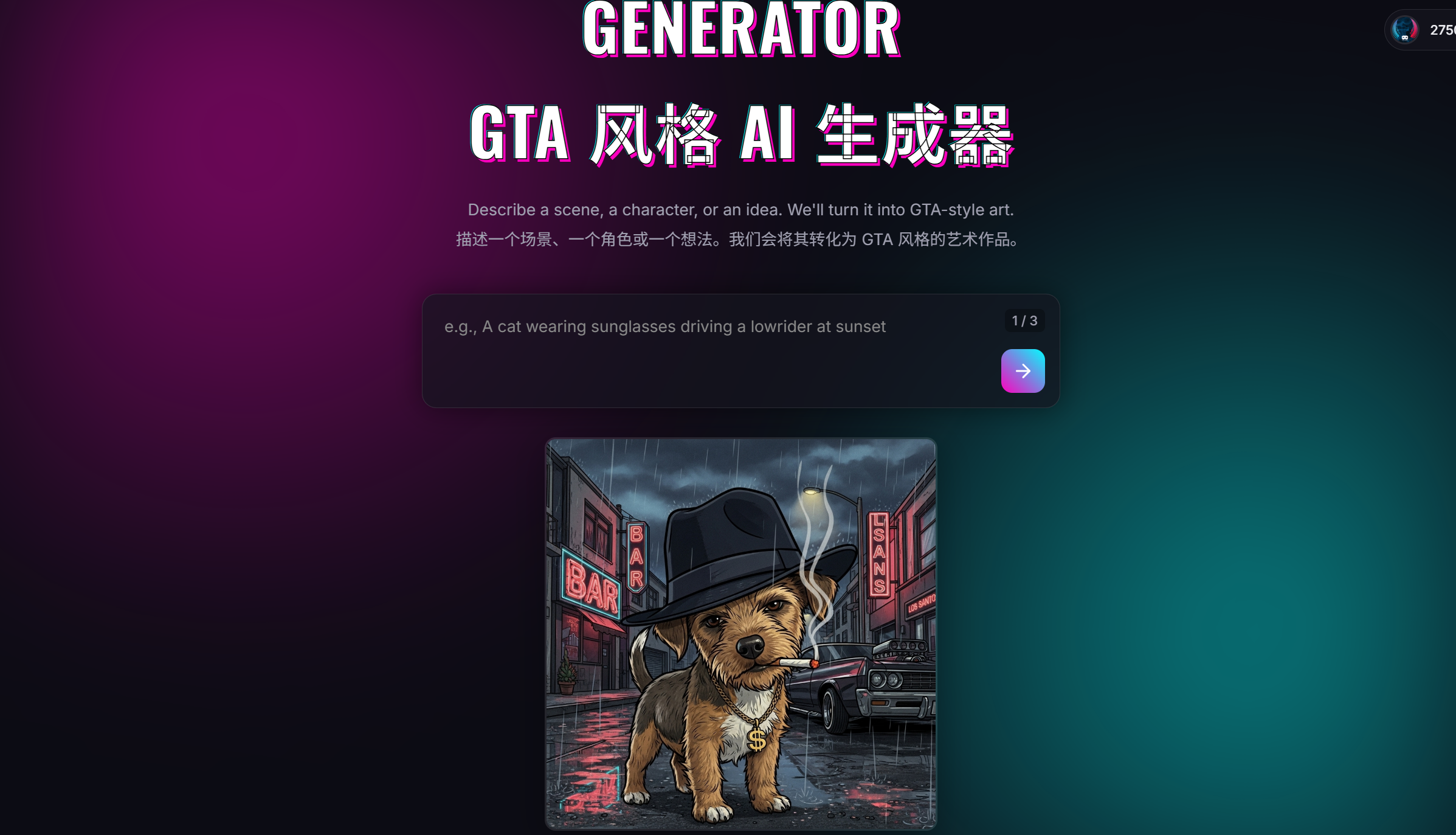 一个名为 GTA 风格 AI 生成器 的 Web 应用,其核心价值在于它提供了一个**"创意放大器"**。它将用户简单的想法,通过后台复杂的提示词扩展和创造性联想,转化为一张具有专业级完成度和文化深度的艺术作品。