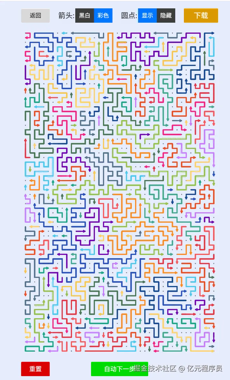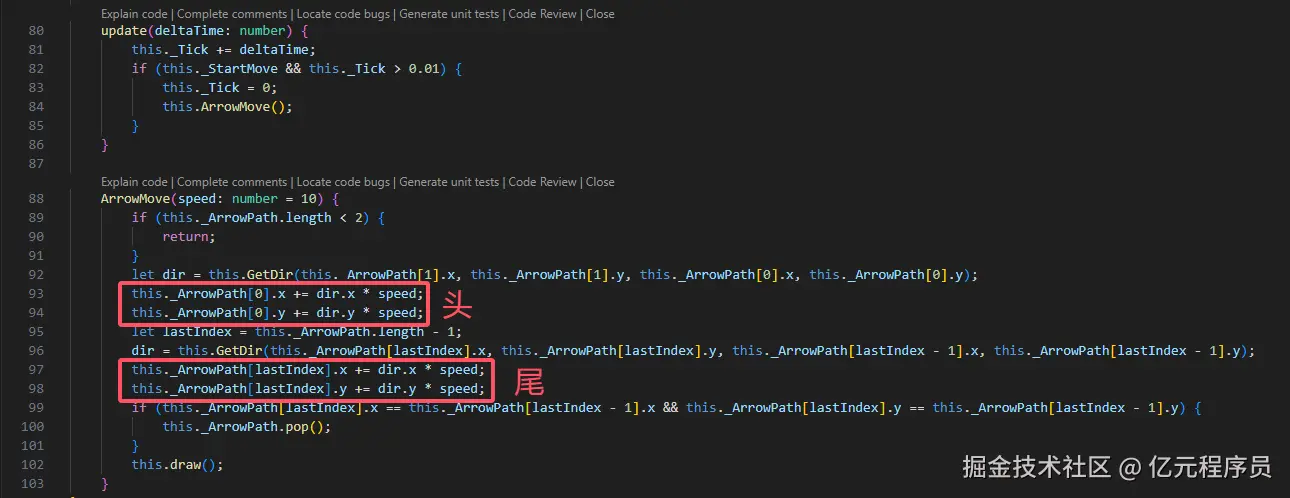 箭头移动的逻辑相对好写一点,就是让头和尾巴的点沿着方向移动即可,当尾巴点和前一节接触后移除。