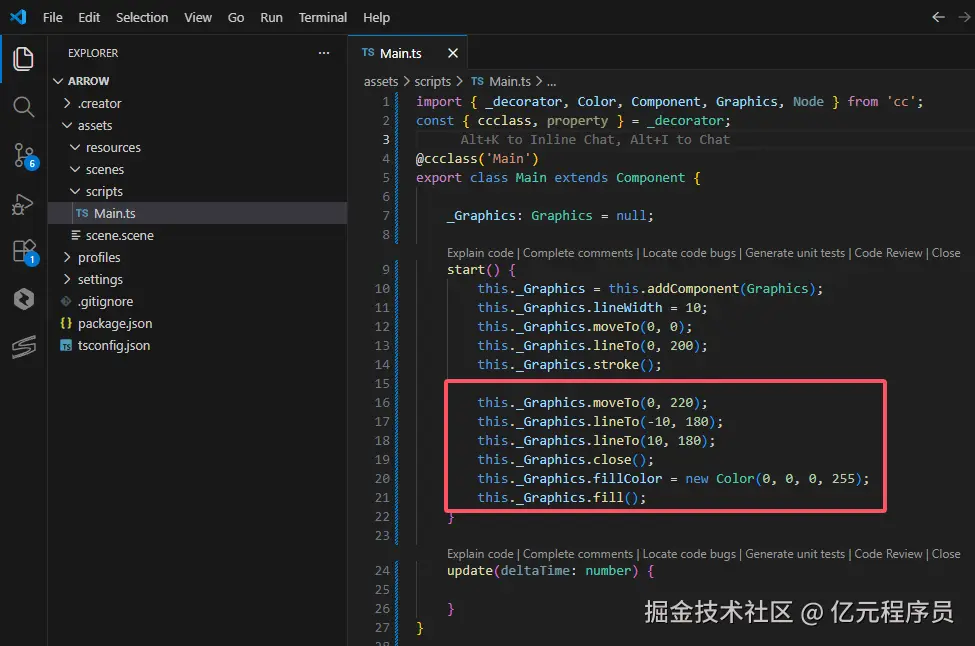 首先 根据原理,我们通过Graphics组件实现,打开Main.ts脚本,在start方法中添加Graphics组件,并且画一根线宽为10,坐标从(0,0)到(0,200)的线。