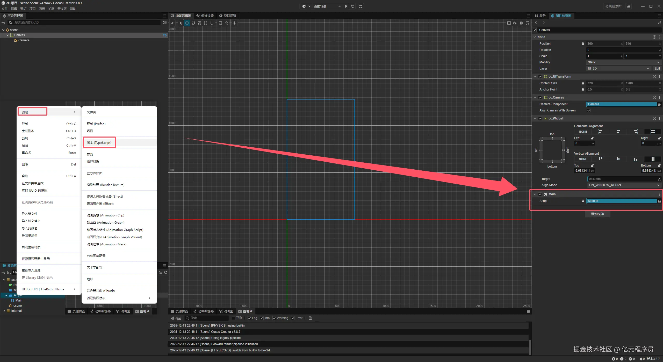 新建 一个Main.ts脚本,并且拖拽到Canvas,用于实现我们的实战逻辑。