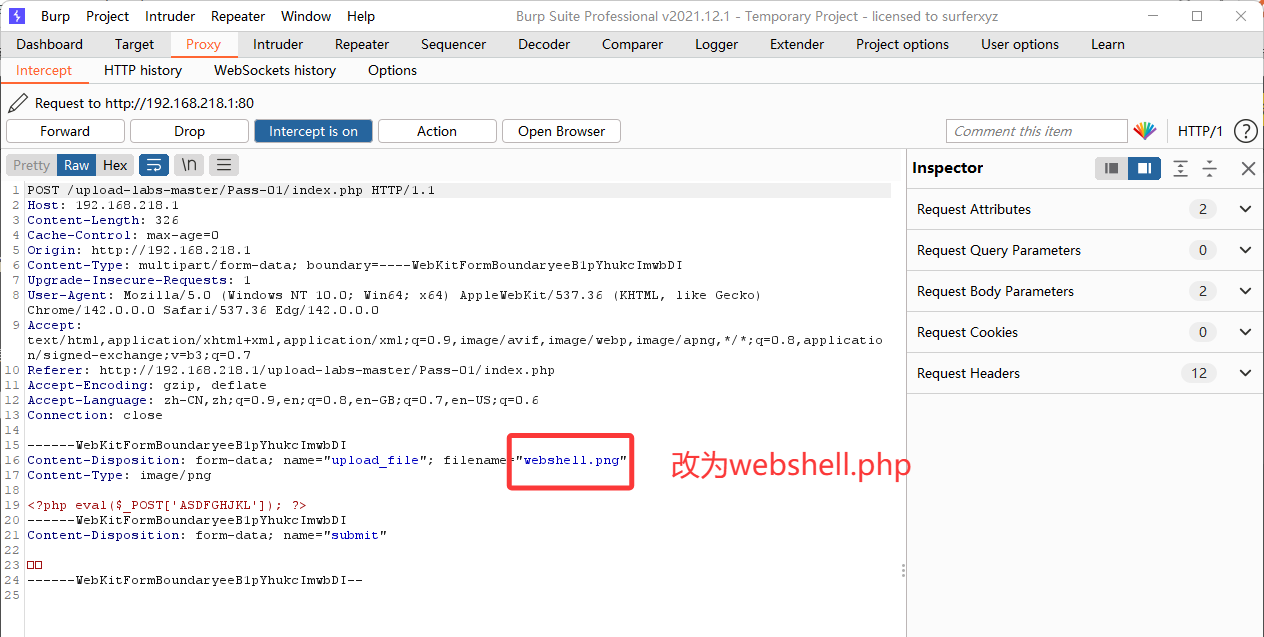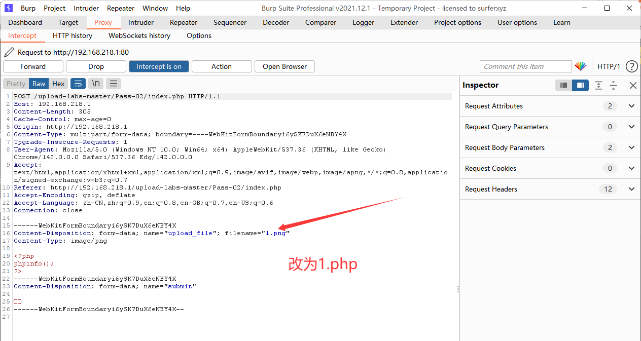 开启bp抓包拦截,上传刚刚创建那个1.png,把1.png改为1.php