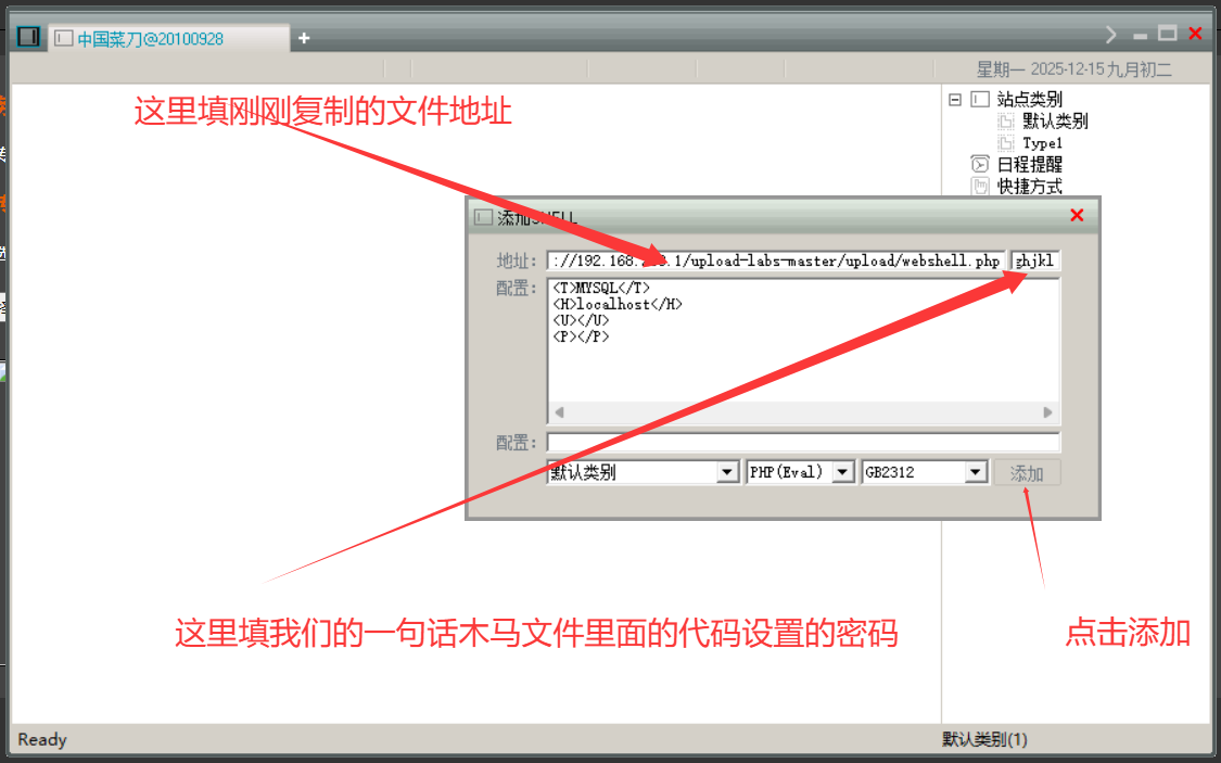 填入复制的文件地址和一句话木马的密码,点击添加。
