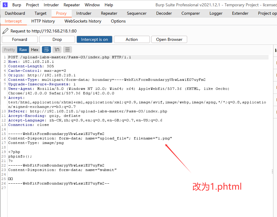 然后开启bp抓包,上传1.png文件,修改1.png后缀为1.phtml