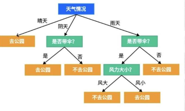 决策树算法会依次考察每个特征(天气、温度、湿度、风速)的信息增益,选择信息增益最大的特征进行分裂。