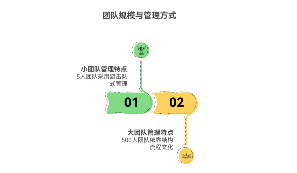 团队规模是决定管理方式和组织效能的核心变量。随着团队规模的扩张,管理方式必须经历从非正式到正式、从"人治"到"法治"、从集中式管控到"去中心化"赋能的系统性转变。 一个5人团队的"游击队"式管理,依赖的是成员间的默契和高频的当面沟通;而一个500人的团队,则必须依靠清晰的组织结构、标准化的流程和强大的文化来管理复杂性。试图用小团队的管理方式去驾驭大团队,必然导致混乱和失控;反之,用大团队的僵化流程去束缚小团队,则会扼杀创新和效率。