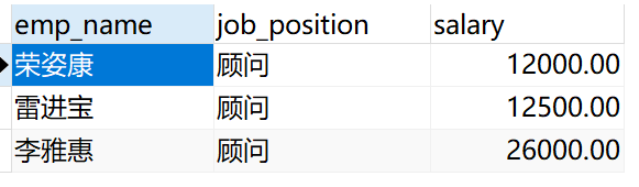 select emp_name, job_position, salary from employee where manager_id in(3, 4, 5); # 结果如下图4