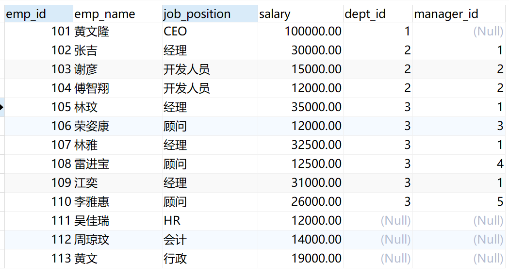 (101, '黄文隆', 'CEO', 100000.00, 1, NULL),