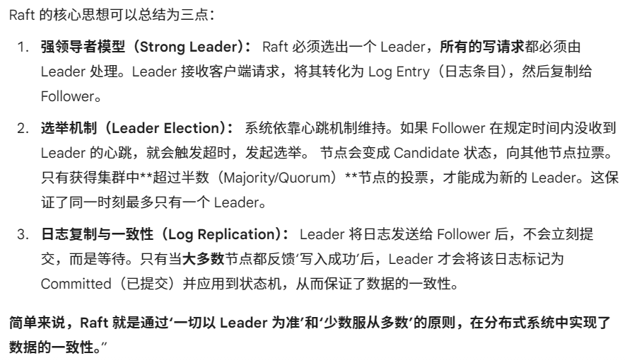 仲裁队列(新版 HA): 这是目前生产环境的首选,用于替代镜像队列的 。它是基于 Raft 一致性算法 实现的。与镜像队列不同,它不需要所有节点都同步数据,只要超过半数(Quorum) 的节点写入成功即可。它在保证数据安全的同时,大幅解决了旧版镜像队列在网络波动时的性能问题。"
