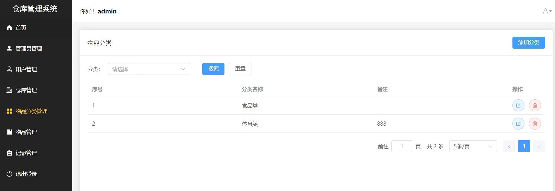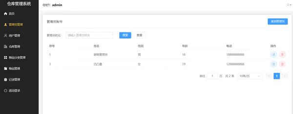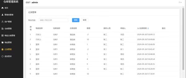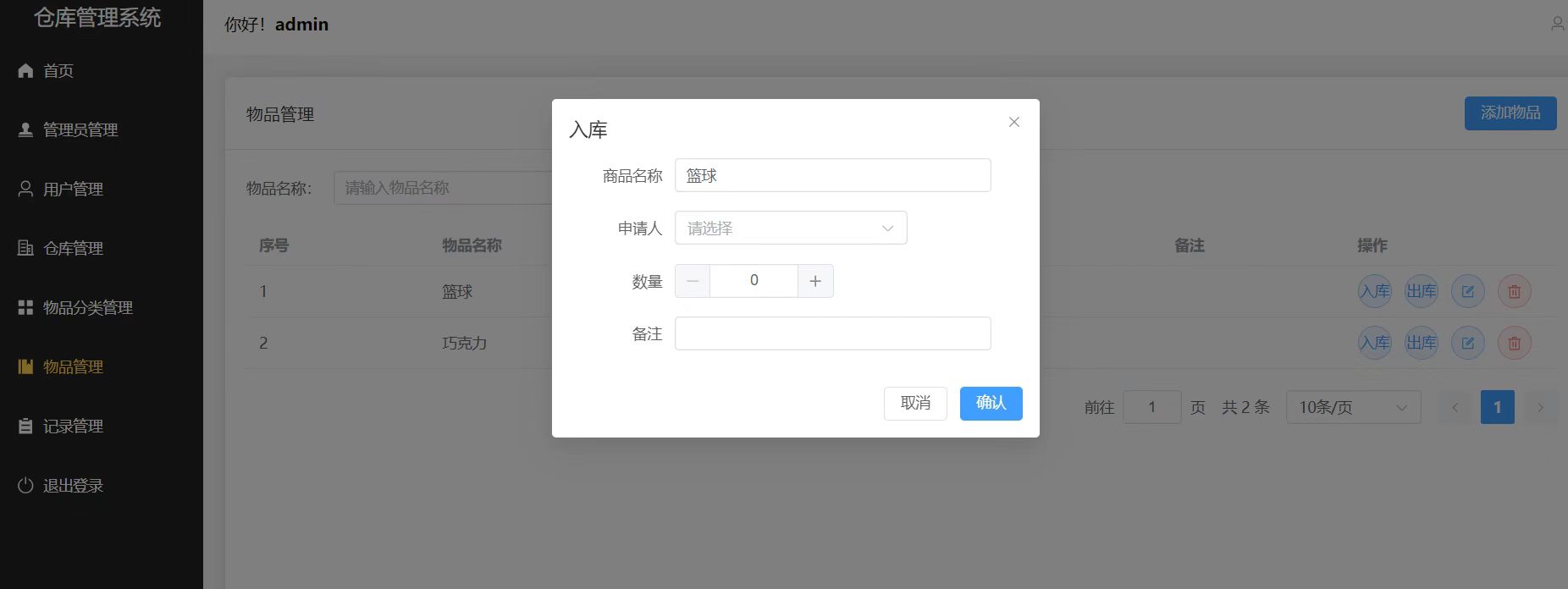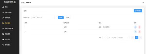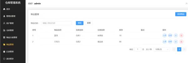 具有管理员管理,通过仓库管理对仓库进行查询增加删除和修改,通过物品分类对分类进行查询增加删除和修改,通过物品管理对物品进行查询增加删除和修改,还可以入库出库操作,可以在记录管理里查看所有的操作记录