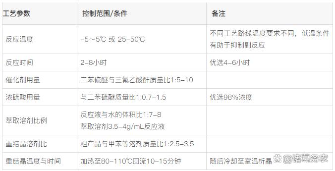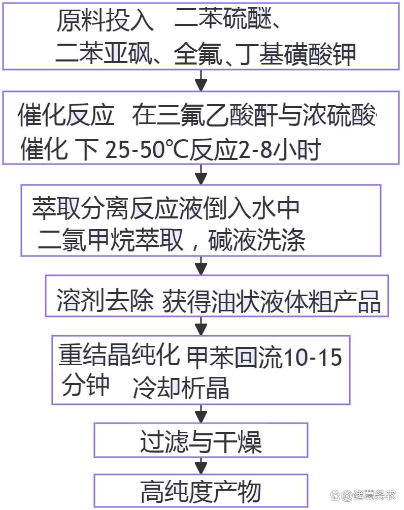 典型的配方中,物料摩尔比是关键参数。例如,合成二苯基[4-(苯硫基)苯基]全氟丁基磺酸锍盐时,二苯硫醚与二苯亚砜的摩尔比约为1:0.8-1.5(优选1:1),其与全氟丁基磺酸钾的质量比约为1:2-3(优选1:2.5-2.8)。