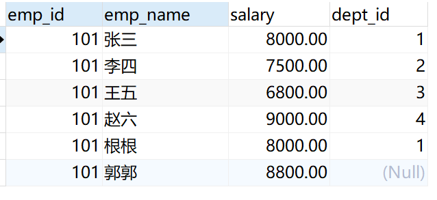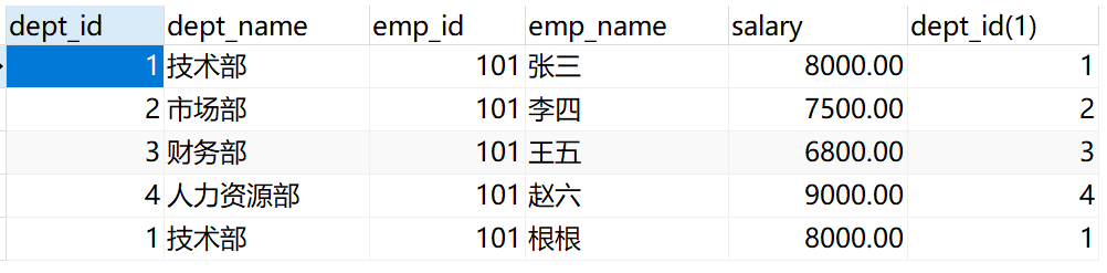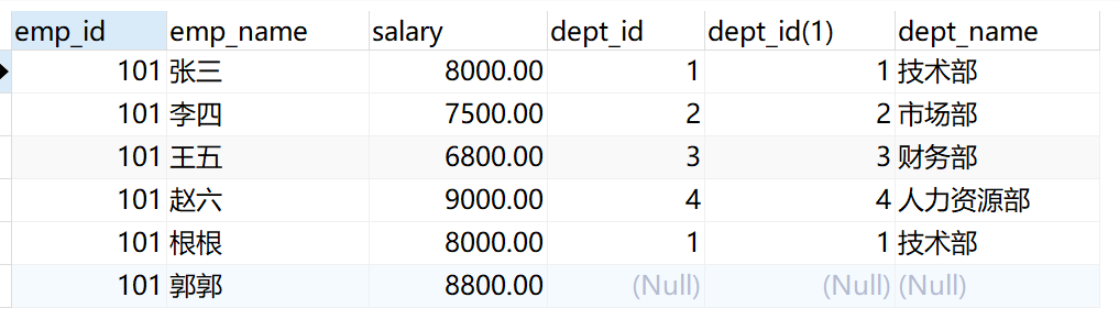 内连接相当于取交集,部门表中的销售部和员工表的郭郭这两条数据不会查询到。