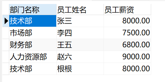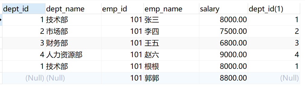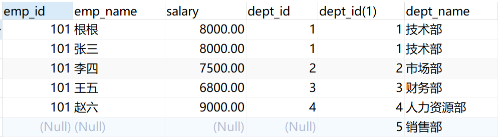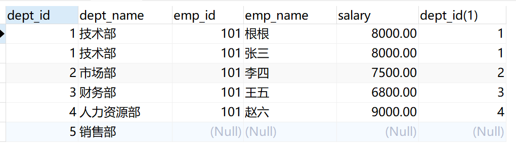 表的连接顺序是:部门表在左,员工表在右;返回部门表的所有行,员工表中无法匹配的数据则显示Null。