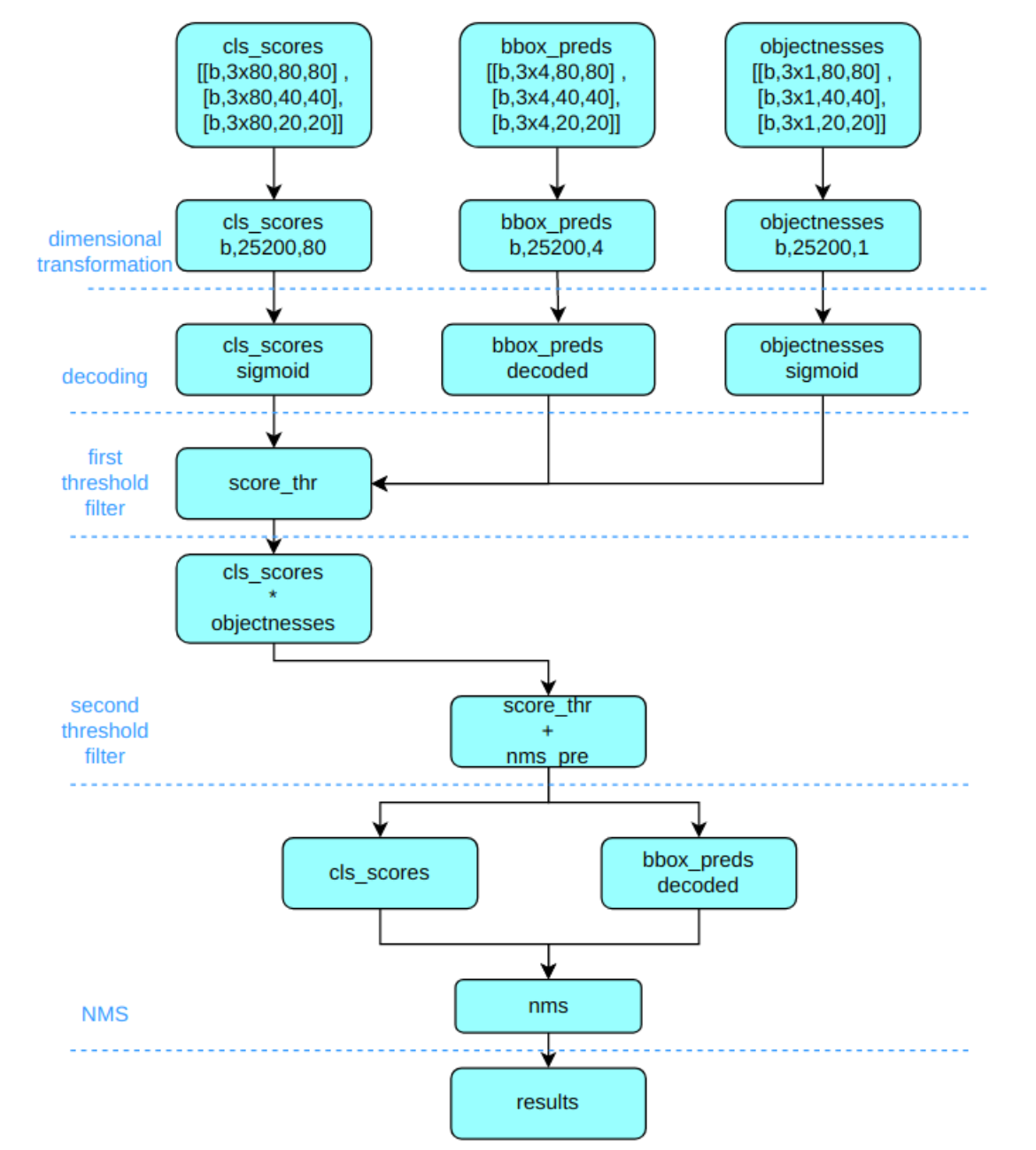 Yolov5 输出特征图尺度为 80x80、40x40 和 20x20 的三个特征图,将三个不同尺度的类别预测分支、bbox 预测分支和 obj 预测分支(对象置信度预测分支)进行拼接,并进行维度变换。为了后续方便处理,会将原先的通道维度置换到最后,类别预测分支、bbox 预测分支和 obj 预测分支的 shape 分别为 (b, 3x80x80+3x40x40+3x20x20, 80)=(b,25200,80),(b,25200,4),(b,25200,1)