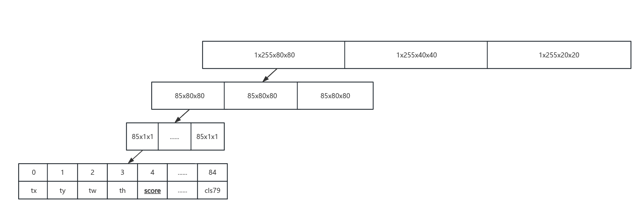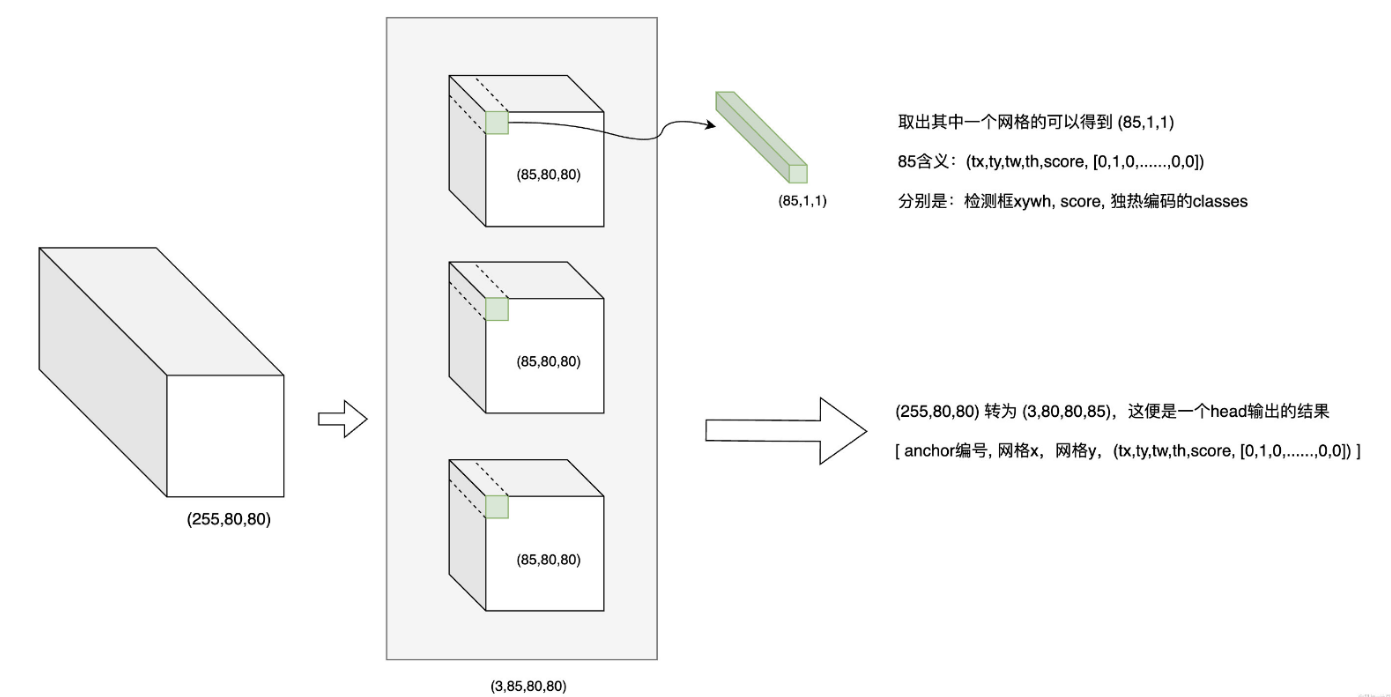 取出其中的一个网格,得到(85, 1, 1),其中85代表的是[tx, ty, tw, th, score, [0, 1, 0,......,0,0]],分识别检测框的 x,y,w,h,obj_socre,classes_score。(255, 80, 80) 转为 (3, 80, 80, 85) 这便是一个 head 输出的结果:[anchor编号, 网格x, 网格y, (tx, ty, tw, th, score, [0, 1, 0,......,0,0])]