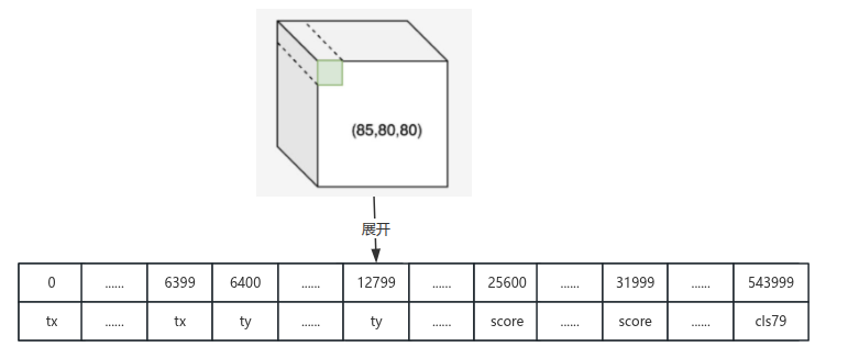 前文已经提到"每个 anchor 在每个网格上有 85 个输出",在85x80x80这个立方体上,85是纵向深度,即如果以85进行再次切隔,可以得到85个面,第一个面是80个网格对应的tx信息,第二个面是80个网格对应的ty信息,第5个面是80个80个网格对应的预测结果信息,第6个面是80个网格对应的类别1的得分信息,第85个面是80个网格对应的类别80的预测信息。将其展开到一纬上,访问时就需要加上偏移量。