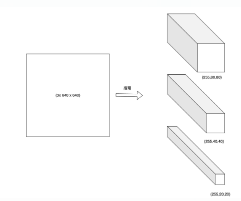 由于 Yolov5 中采用的是 anchoer based 的方式,每个网格上有 3 个 anchor。以检测头(255, 80, 80)为例,可以将其拆分为 3 个 tensor, 每个 tensor 的大小为 (85, 80, 80),即每个 anchor 在每个网格(grid)上有 85 个输出;