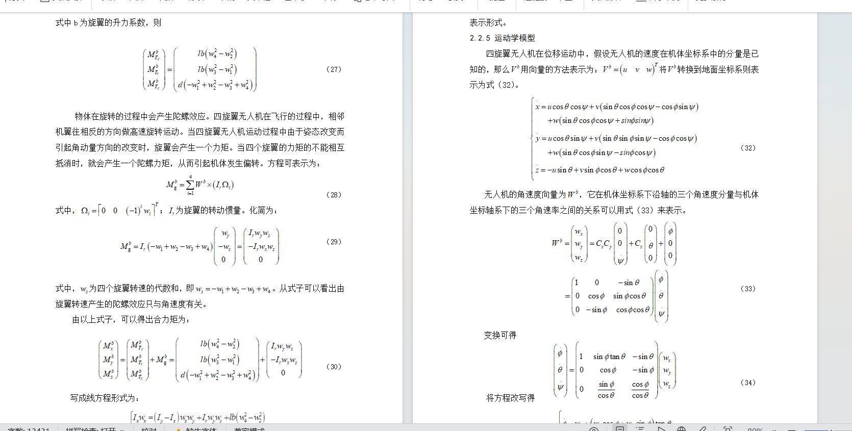 四旋翼无人机的动力学模型是其控制的基础,它主要包含力方程组与力矩方程组。