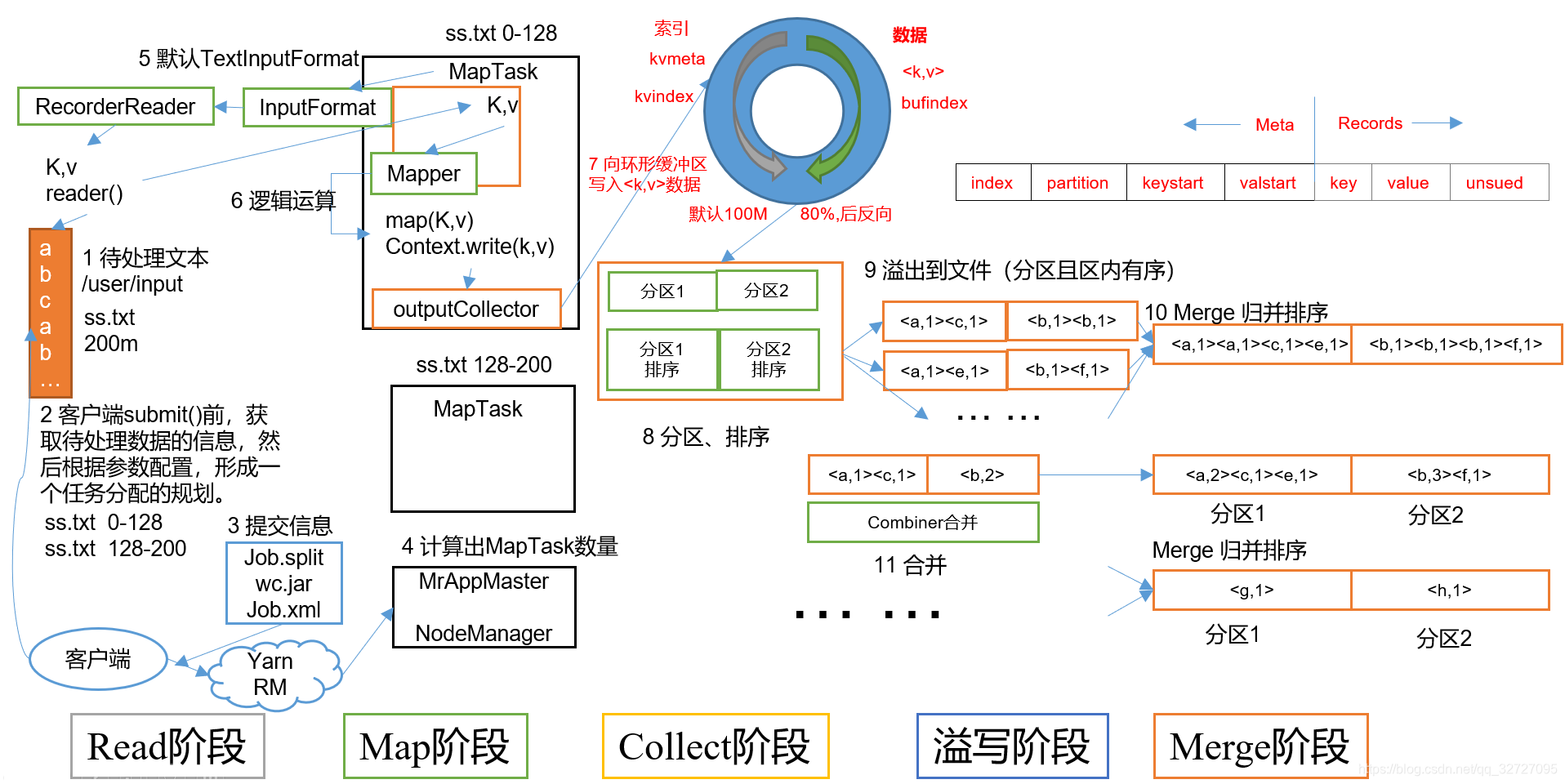 对应的,我们可以把MapTask分为五个阶段,对应的是Read,Map,Collect,spill,merge。以下是更为详细的阐述。