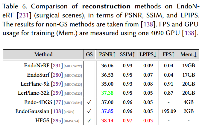 与一般的动态场景相比,该任务引入了不同的挑战,包括狭窄腔体中有限的相机移动性导致的稀疏训练数据、遮挡关键区域的工具遮挡以及单视图几何歧义。现有的方法主要使用额外的深度引导来推断组织[ 77、138、308 ]的几何形状。例如,EndoGS [ 308 ]将深度引导的监督与时空权重掩码和表面对齐的正则化项相结合,在解决工具遮挡的同时提高了3D组织渲染的质量和速度。Endo Gaussian [ 138 ]介绍了两种新策略:用于稠密初始化的整体高斯初始化和用于建模表面动力学的时空高斯跟踪。Zhao et al 文献[ 295 ]认为这些方法存在重建不足的问题,并提出从频率角度来缓解这一问题。此外,EndoGSLAM [ 228 ]和Gaussian Pancake [ 12 ]设计了适用于内窥镜场景的SLAM系统,并表现出显著的速度优势。