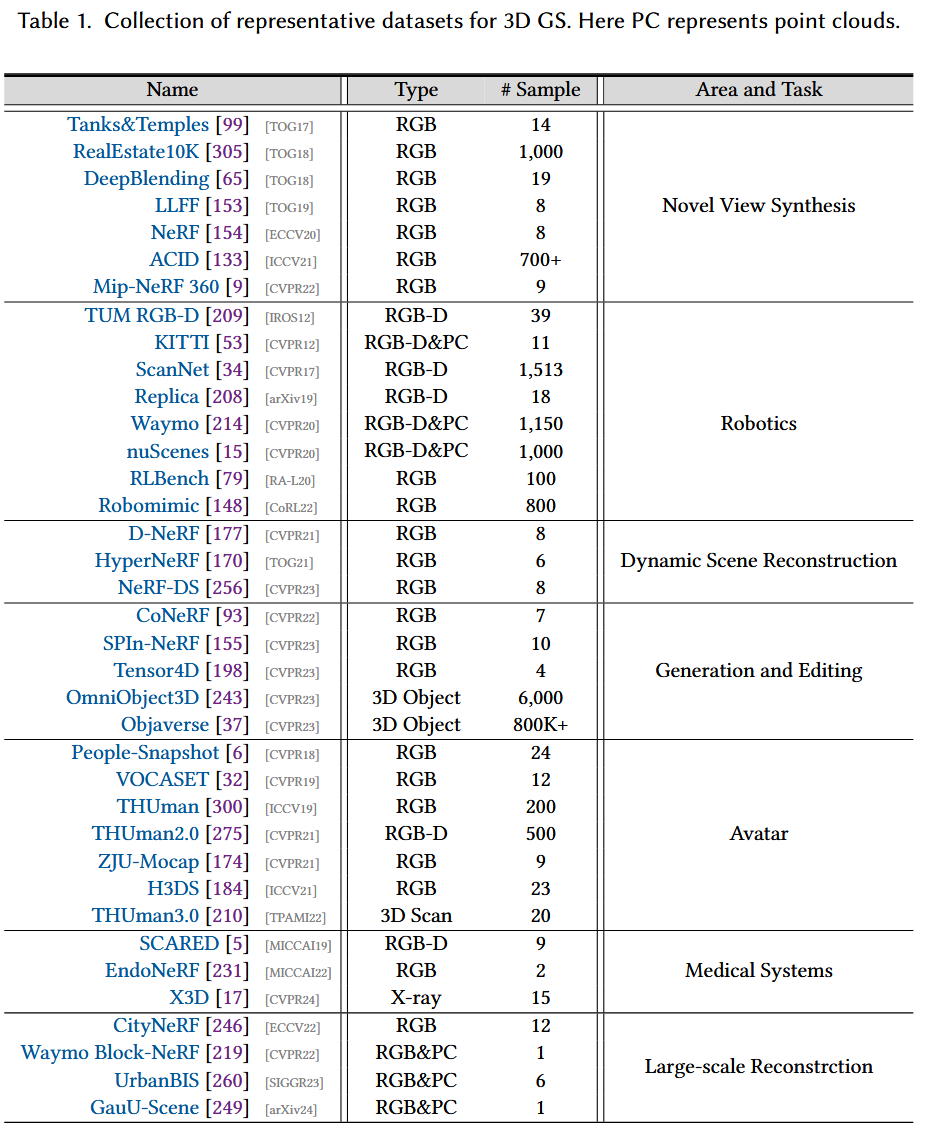 在这一部分中,我们通过展示我们先前讨论的几种3D GS算法的性能来提供更多的经验证据。3D GS在众多任务中的多样化应用,以及为每个任务定制的算法设计,使得在单个任务或数据集上对所有3D GS算法进行统一比较变得不切实际。为了全面起见,按照图2所示的分类方法,我们在表1中提供了一组具有代表性的数据集。由于篇幅有限,我们选择了几个具有代表性的任务进行了深入的性能评估。成绩分数主要来源于原始试卷,除非另有说明。我们还为这一部分维护了一个Github存储库。