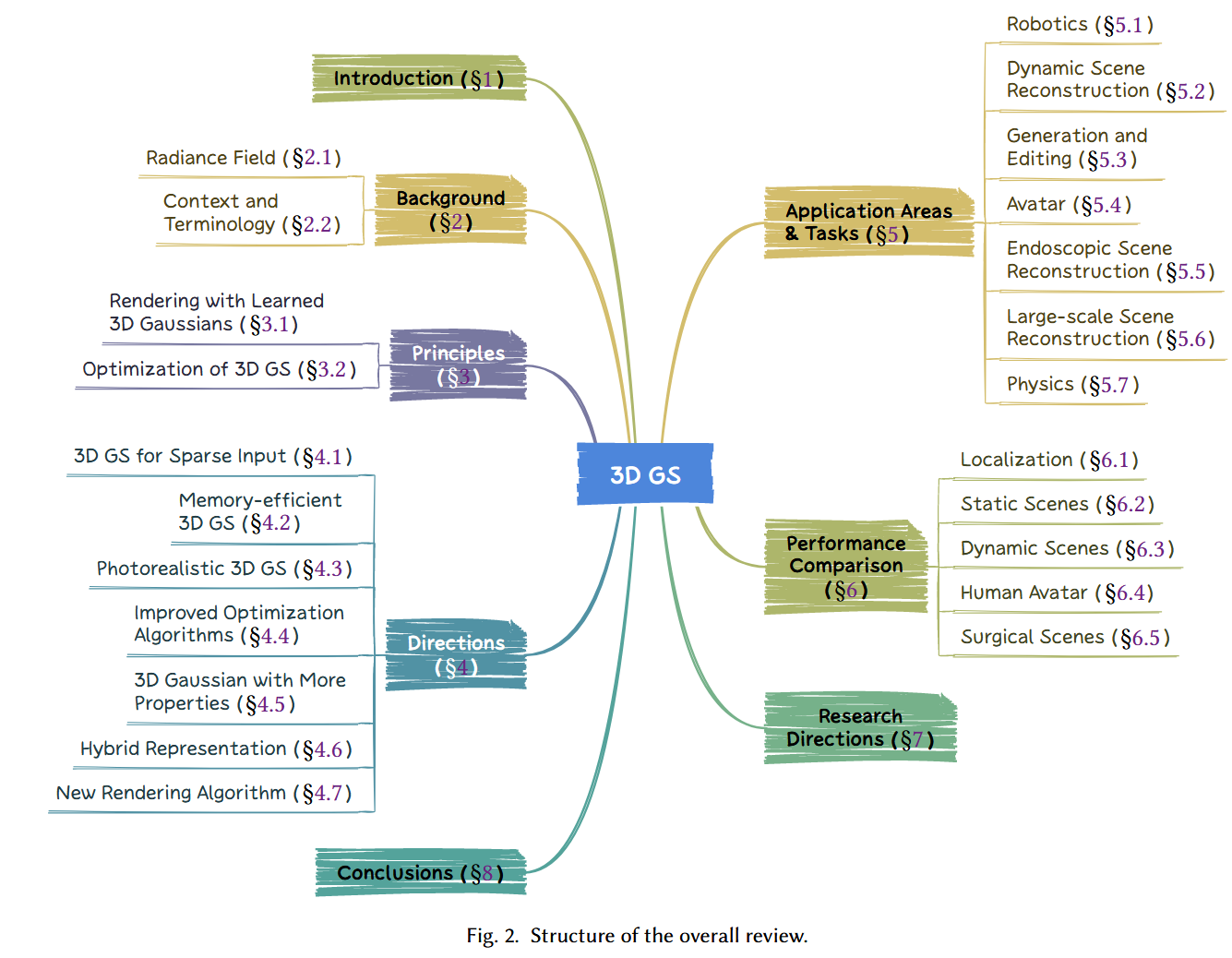据我们所知,这项研究首次对3D GS进行了全面的综述,这项开创性的技术革新了显式辐射场、计算机图形学和计算机视觉。它描述了从传统的基于NeRF方法的范式转换,突出了3D GS在实时渲染和增强可编辑性方面的优势。我们的深入分析和大量的定量研究证明了3D GS在实际应用中的优越性,特别是那些对潜伏期高度敏感的应用。我们对这一领域的原则、未来的研究方向和尚未解决的挑战提出了见解。 总体而言,3D GS是一项变革性技术,将对未来3D重建和表示的发展产生重大影响。这项调查旨在作为一项基础性资源,推动这一迅速发展的领域的进一步探索和进展。