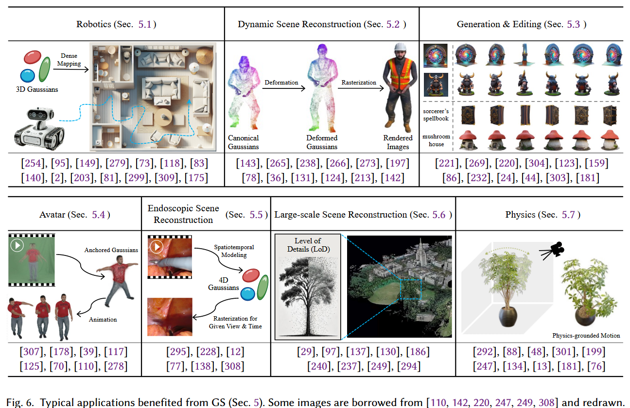 在3D GS快速发展的基础上,跨越多个领域( c. f.图6)出现了广泛的创新应用,如机器人学( Sec。5 . 1 )、动态场景重建与表示( Sec。5 . 2 )、生成与编辑( Sec。5 . 3 )、化身( Sec。5 . 4 )、医疗系统( Sec。5 . 5 )、大规模场景重建( Sec。5 . 6 )、物理学( Sec。5 . 7 ),甚至其他科学学科[ 113 , 241 , 290 , 291]。在这里,我们突出强调了3D GS的变革性影响和潜力的关键例子,并在Github中提供了更全面的集合。根据我们的分类标准,我们还提供了一组具有代表性的数据集( c. f.表1)。