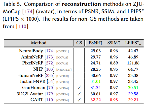 - 结果:表5给出了人体头像建模中顶尖解决方案的数值结果。 我们观察到,将3D GS引入到框架中会导致渲染质量和速度的一致性能提升。例如,GART [ 110 ]比目前的SOTA,Instant-NVR [ 54 ]提高了1。21dB。考虑到增强的逼真度、推理速度和可编辑性,基于3D GS的化身建模可能会给3D动画、交互游戏等领域带来革命性的变化。