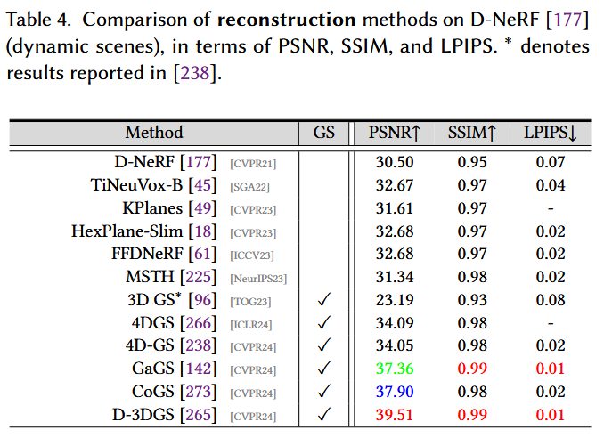 - 基准测试算法:为了性能比较,我们涉及5篇最近的论文,它们使用3D GS [ 142、238、265、266、273]建模动态场景,以及6个基于NeRF的方法[ 61、177、225]。