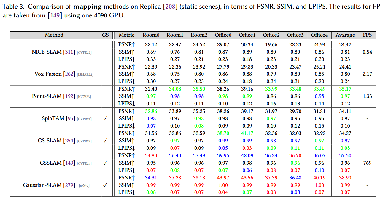 - 结果:表3显示,基于3D高斯的系统通常优于三个稠密SLAM竞争者。例如,Gaussian-SLAM [ 279 ]建立了新的SOTA,并且大大优于以前的方法。 与Point - SLAM [ 192 ]相比,GSSLAM [ 149 ]在达到非常有竞争力的精度方面快了约578倍。与以前依赖于深度信息的方法[ 192 ]相比,例如深度引导的光线采样,用于合成新的视图,基于3D GS的系统消除了这一需求,允许对任何视图进行高保真渲染。