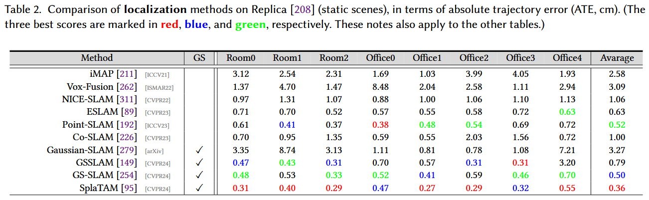 - 结果:如表2所示,最近的基于3D高斯的定位算法与现有的基于NeRF的稠密视觉SLAM相比具有明显的优势。例如,SplaTAM [ 95 ]实现了50 %的轨迹误差改善,从0降低。52Cm降至0 . 36cm,高于之前的最先进水平( SOTA ) [ 192 ]。我们将这归因于为场景重建的稠密且精确的3D高斯,它可以处理真实传感器的噪声。 这说明有效的场景表征可以提高定位任务的精度。