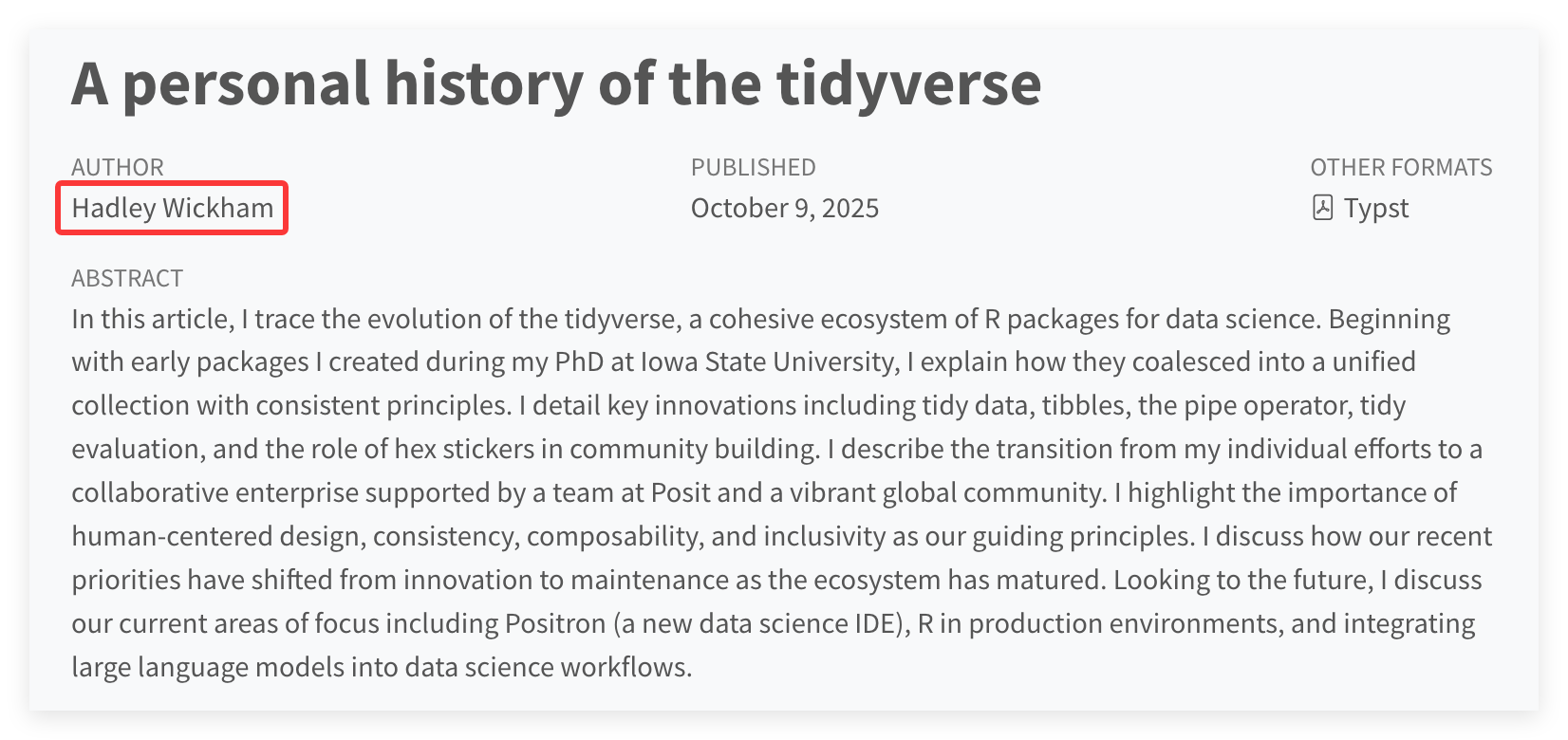 2025年10月9日,R语言世界明星人物Hadley Wickham,发长文回顾R语言Data science主流工具tidyverse的过去20年的演进之路、现状与未来展望!