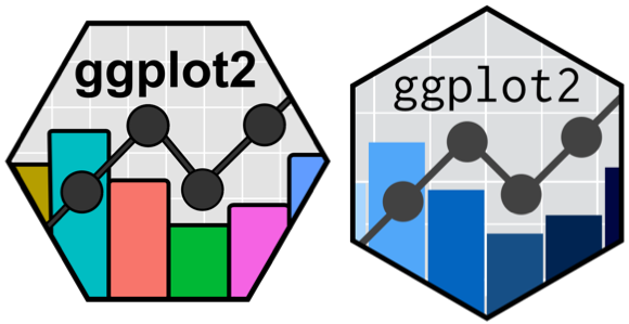 图 3:ggplot2 六边形徽标的两个早期版本。我找不到任何关于第一个版本(左图)创作者的记录,但考虑到六边形的方向不正确,我推测是我创作的。第二个版本(右图)是我与 Garrett Grolemund 共同创作的。