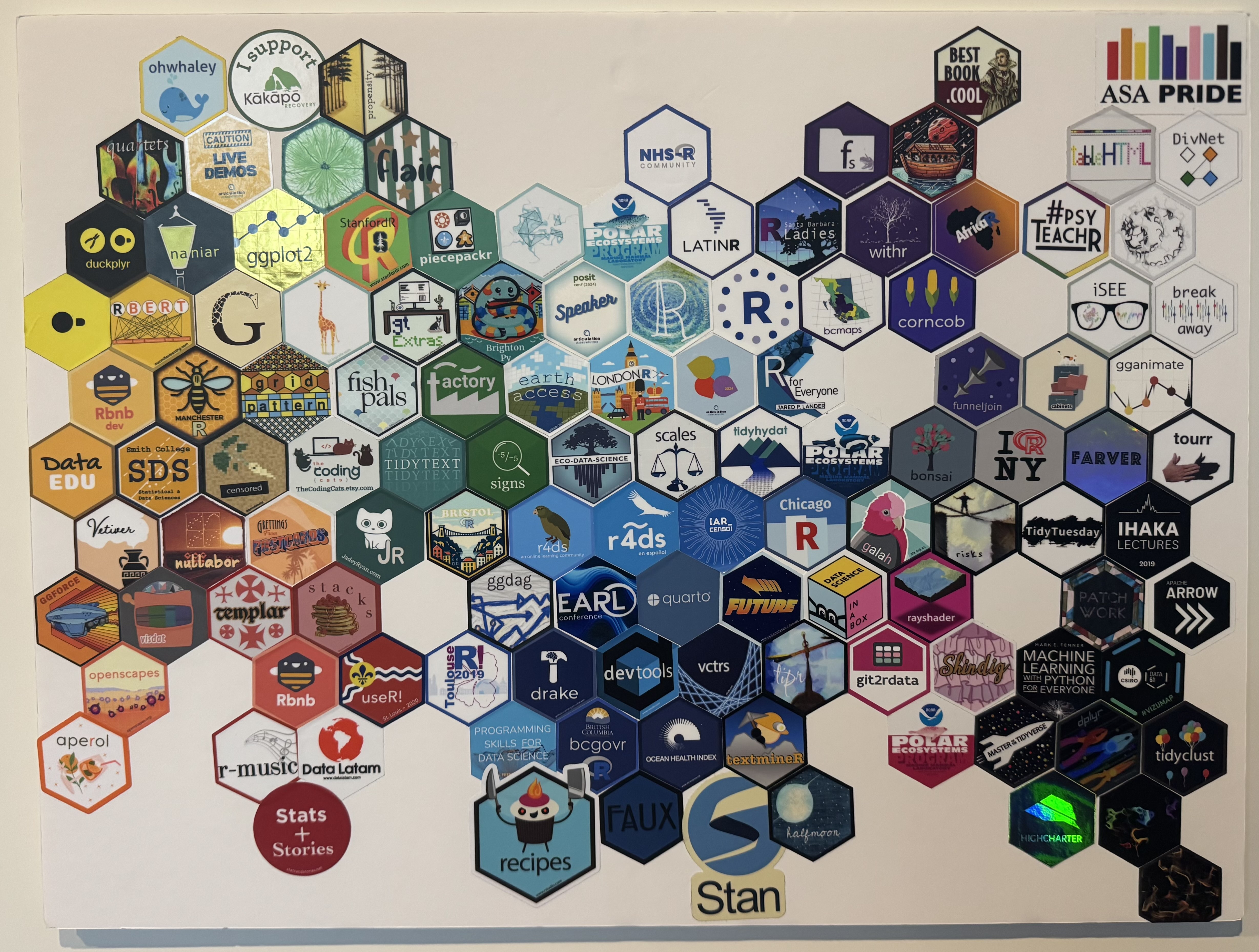 如今,大量的软件包都有自己的 logo,我非常欣赏软件包作者们在设计中展现出的创造力和多样性!我喜欢用十六进制贴纸来构建社区:人们看到你的笔记本电脑,就能立刻认出你是 R 社区的一员,并了解你使用 R 的用途。我听说过很多这样的故事:人们仅仅因为认出了贴纸就主动与陌生人攀谈起来。它们的作用类似于交换卡片,图 4展示了我这些年来收集的一些贴纸。