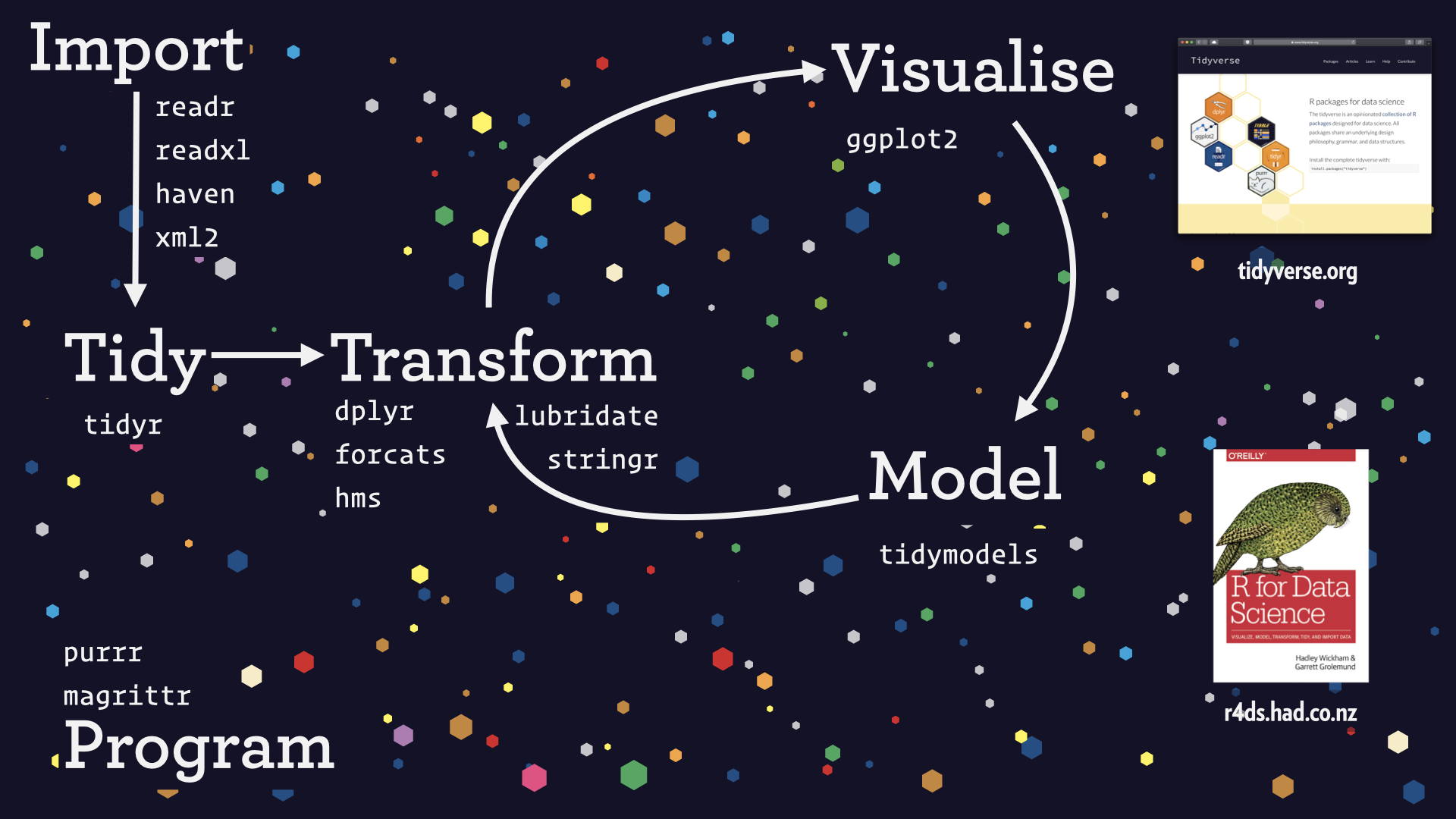 图 2:tidyverse 的软件包,其组织方式基于我构建的数据科学工作流模型的部分版本。缺失的步骤是沟通,这需要借助 tidyverse 之外的工具,例如 Quarto 和 Shiny。此图出自我在 2020 年发表的题为"数据科学的乐趣"的演讲。