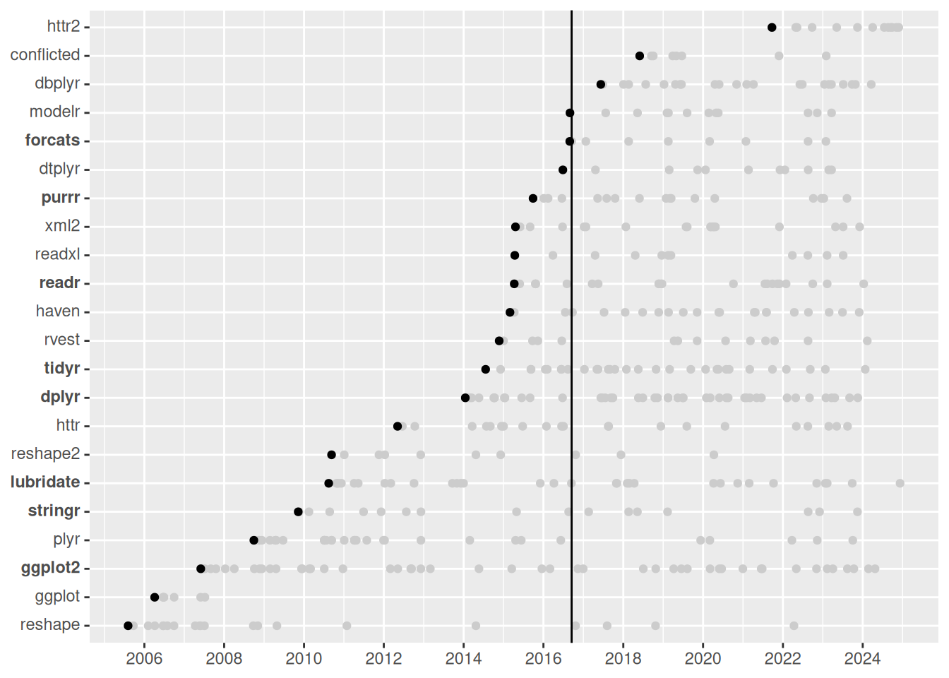 图 1:tidyverse 软件包及其重要前身的初始版本。垂直线表示 tidyverse 软件包的发布时间。核心 tidyverse 软件包在 y 轴标签中以粗体显示。黑点代表初始版本,灰点代表后续版本