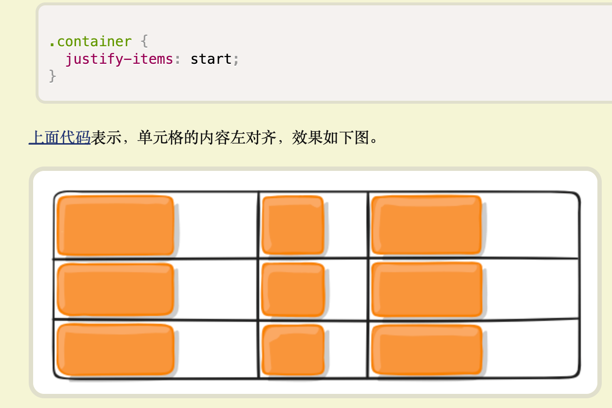 justify-items属性:设置单元格内容的水平位置(左中右),align-items属性:设置单元格内容的垂直位置(上中下)