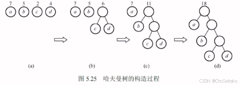 从上述构造过程中可以看出哈夫曼树具有如下特点:1) 每个初始结点最终都成为叶结点,且权值越小的结点到根结点的路径长度越大。2) 构造过程中共新建了 n−1 个结点(双分支结点),因此哈夫曼树的结点总数为 2n−1。3) 每次构造都选择2棵树作为新结点的孩子,因此哈夫曼树中不存在度为1的结点。例如,权值{7,5,2,4}的哈夫曼树的构造过程如图5.25所示。 \begin{aligned} &\text{从上述构造过程中可以看出哈夫曼树具有如下特点:} \\ &\quad 1) \ \text{每个初始结点最终都成为叶结点,且权值越小的结点到根结点的路径长度越大。} \\ &\quad 2) \ \text{构造过程中共新建了} \ n-1 \ \text{个结点(双分支结点),因此哈夫曼树的结点总数为} \ 2n-1。 \\ &\quad 3) \ \text{每次构造都选择2棵树作为新结点的孩子,因此哈夫曼树中不存在度为1的结点。} \\ &\text{例如,权值}\{7,5,2,4\}\text{的哈夫曼树的构造过程如图5.25所示。} \end{aligned} 从上述构造过程中可以看出哈夫曼树具有如下特点:1) 每个初始结点最终都成为叶结点,且权值越小的结点到根结点的路径长度越大。2) 构造过程中共新建了 n−1 个结点(双分支结点),因此哈夫曼树的结点总数为 2n−1。3) 每次构造都选择2棵树作为新结点的孩子,因此哈夫曼树中不存在度为1的结点。例如,权值{7,5,2,4}的哈夫曼树的构造过程如图5.25所示。