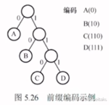 前缀编码的分析及应用利用二叉树来进行哈夫曼编码的设计可以利用二叉树来设计二进制前缀编码。假设为A, B, C, D四个字符设计前缀编码,可以用图5.26所示的二叉树来表示,4个叶结点分别表示4个字符,且约定左分支表示0,右分支表示1,从根到叶结点的路径上用分支标记组成的序列作为该叶结点字符的编码,可以证明如此得到的必为前缀编码。由图5.26得到字符A, B, C, D的前缀编码分别为0, 10, 110, 111。 \begin{aligned} &\textbf{前缀编码的分析及应用} \quad \boldsymbol{\text{利用二叉树来进行哈夫曼编码的设计}} \\ &\text{可以利用二叉树来设计二进制前缀编码。假设为A, B, C, D四个字符设计前缀编码,可以用} \\ &\text{图5.26所示的二叉树来表示,4个叶结点分别表示4个字符,且约定左分支表示0,右分支表示} \\ &\text{1,从根到叶结点的路径上用分支标记组成的序列作为该叶结点字符的编码,可以证明如此得到} \\ &\text{的必为前缀编码。由图5.26得到字符A, B, C, D的前缀编码分别为0, 10, 110, 111。} \end{aligned} 前缀编码的分析及应用利用二叉树来进行哈夫曼编码的设计可以利用二叉树来设计二进制前缀编码。假设为A, B, C, D四个字符设计前缀编码,可以用图5.26所示的二叉树来表示,4个叶结点分别表示4个字符,且约定左分支表示0,右分支表示1,从根到叶结点的路径上用分支标记组成的序列作为该叶结点字符的编码,可以证明如此得到的必为前缀编码。由图5.26得到字符A, B, C, D的前缀编码分别为0, 10, 110, 111。