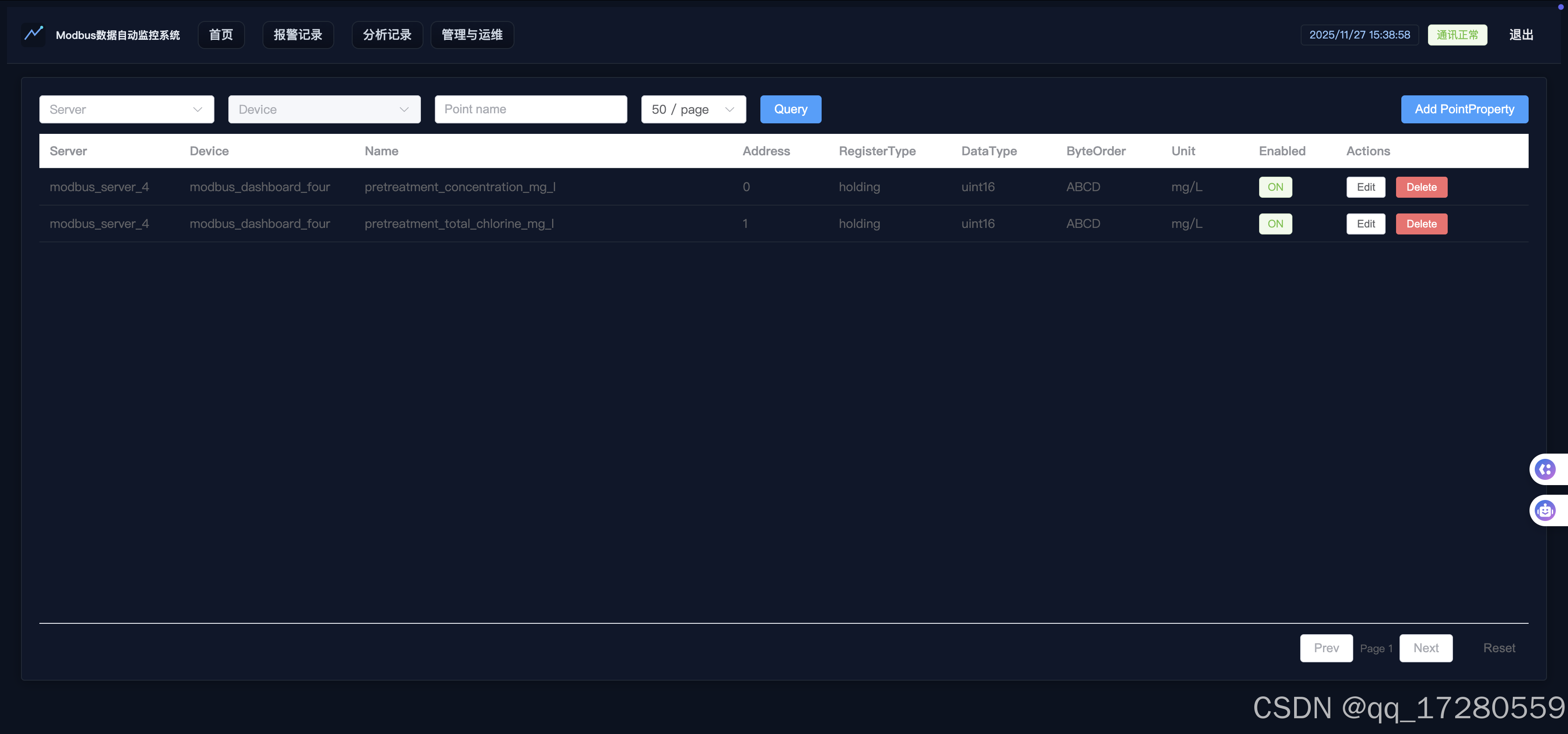 统一管理所有 Modbus 服务器(TCP 与 RTU),支持新增、编辑、启用/停用及运行状态查看。