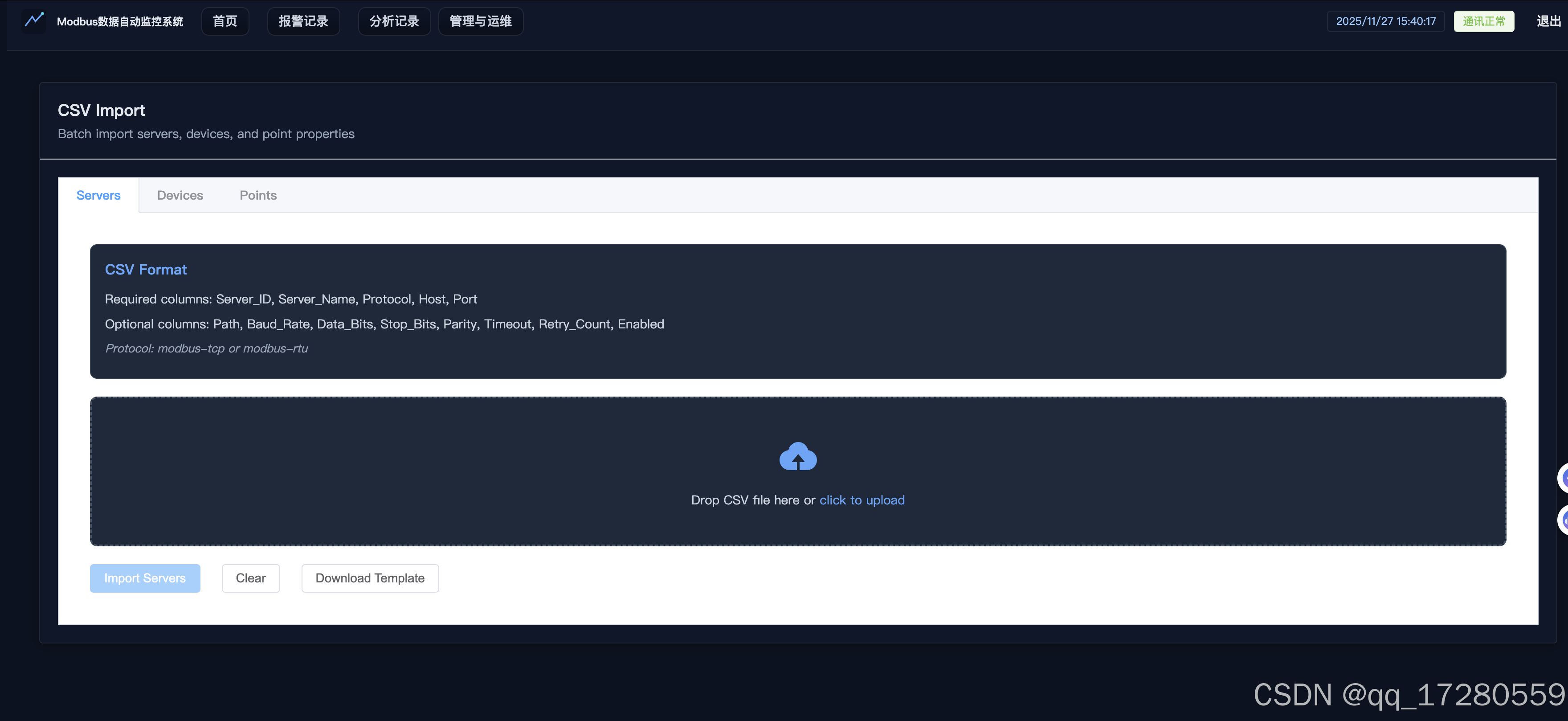 支持通过 CSV 文件批量导入服务器、设备、点位配置,适合从 Excel/设计文档迁移配置。