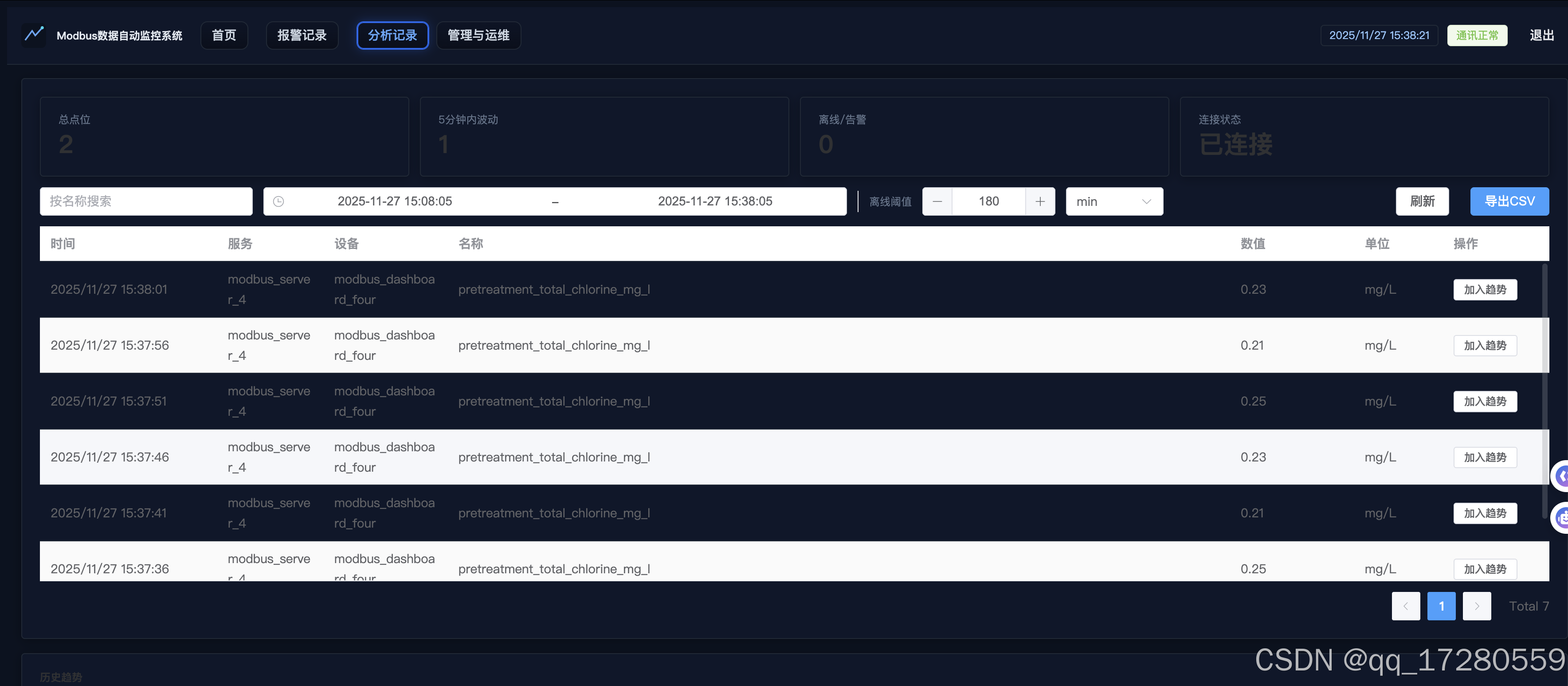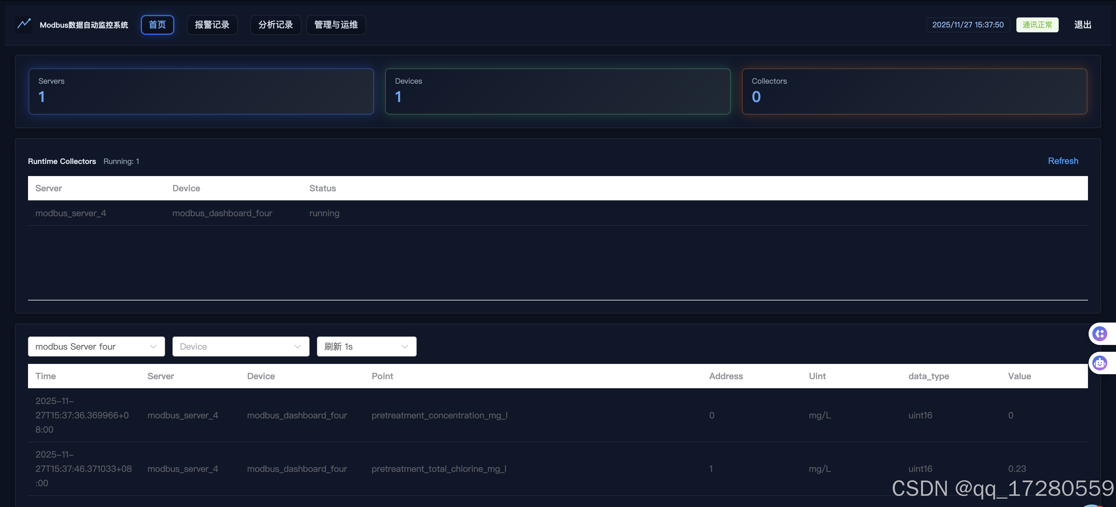 通过 Web 界面即可配置 Modbus TCP 与 RTU,无需手写采集代码。 - 📊 实时监控 + 历史追溯