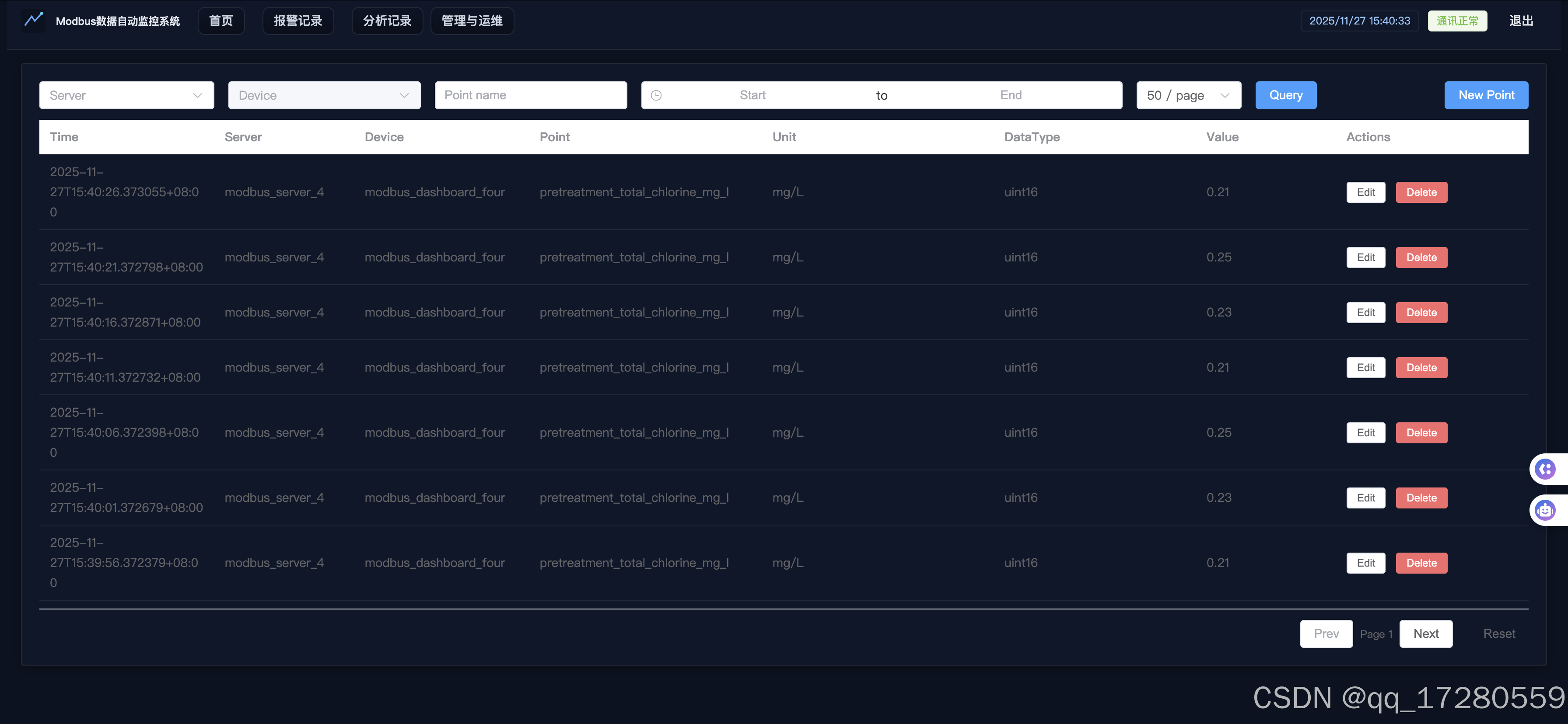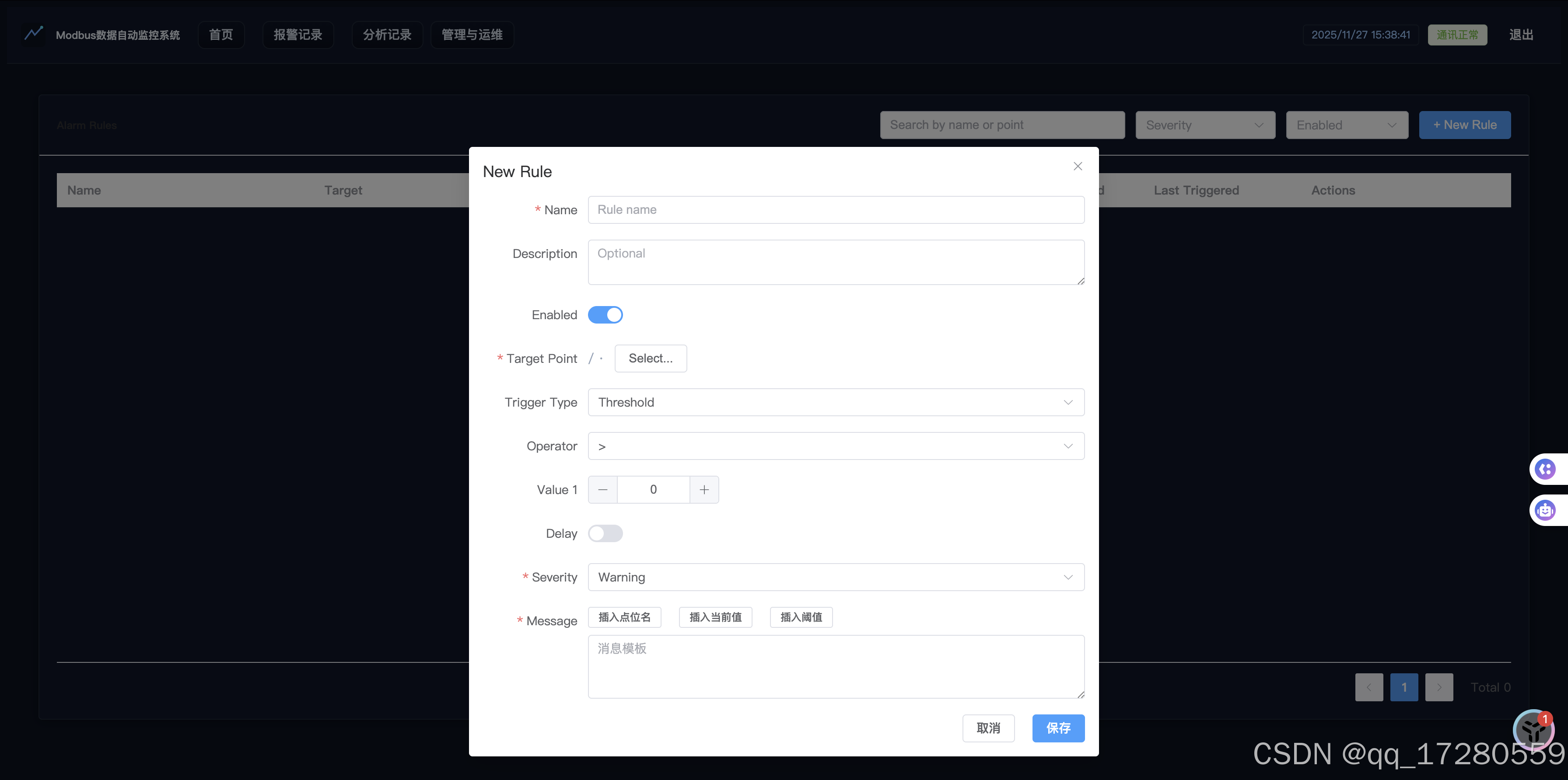 仪表盘实时展示关键点位,历史数据统一存储,支持查询与分析。 - 🚨 灵活的告警规则系统