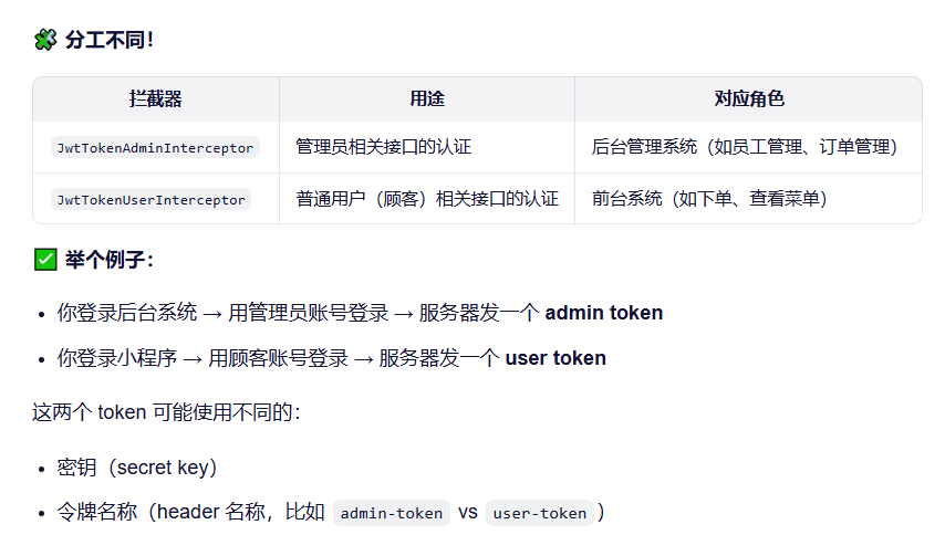 jwt格式(头、载荷、签名),token会存在cookie中;俩个拦截器,小程序,后台